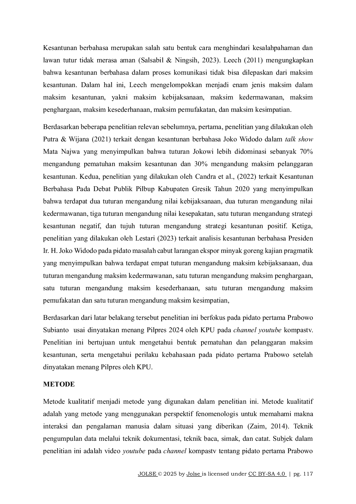 Journal of Language SectorJournal of Language SectorPeran bahasa dalam komunikasi menjadi hal yang sangat krusial. Tujuan diadakannya penelitian ini adalah mengetahui jenis pematuhan dan pelanggaran maksim kesantunan berbahasa pidato pertama Prabowo Subianto usai dinyatakan menang Pilpres 2024 oleh KPU pada channel youtube kompastv. Penelitian ini menggunakan metode kualitatif. Teknik pengumpulan data melalui teknik dokumentasi, teknik baca, teknik simak, dan teknik catat. Subjek dalam penelitian ini adalah video youtube pada channel kompastv tentang pidato pertama Prabowo setelah dinyatakan menang Pilpres 2024. Objek dalam penelitian ini adalah seluruh tuturan Prabowo Subianto pada pidato pertamanya usai dinyatakan menang pilpres 2024 oleh KPU pada channel youtube kompastv. Melalui analisisnya, peneliti menganalisis dan mengkategorikan seluruh tuturan ke dalam pendekatan maksim kesopanan dari Leech, yang meliputi maksim kebijaksanaan, kedermawanan, penghargaan, kesederhanaan, pemufakatan, dan maksim kesimpatian. Hasil penelitian menunjukkan terdapat 3 data mengandung pematuhan maksim kebijaksanaan, 5 data mengandung pematuhan maksim penghargaan, 1 data mengandung pematuhan maksim kesederhanaan, 4 data mengandung maksim pemufakatan, 4 data mengandung maksim kesimpatian, dan 1 data mengandung pelanggaran maksim kesimpatian.