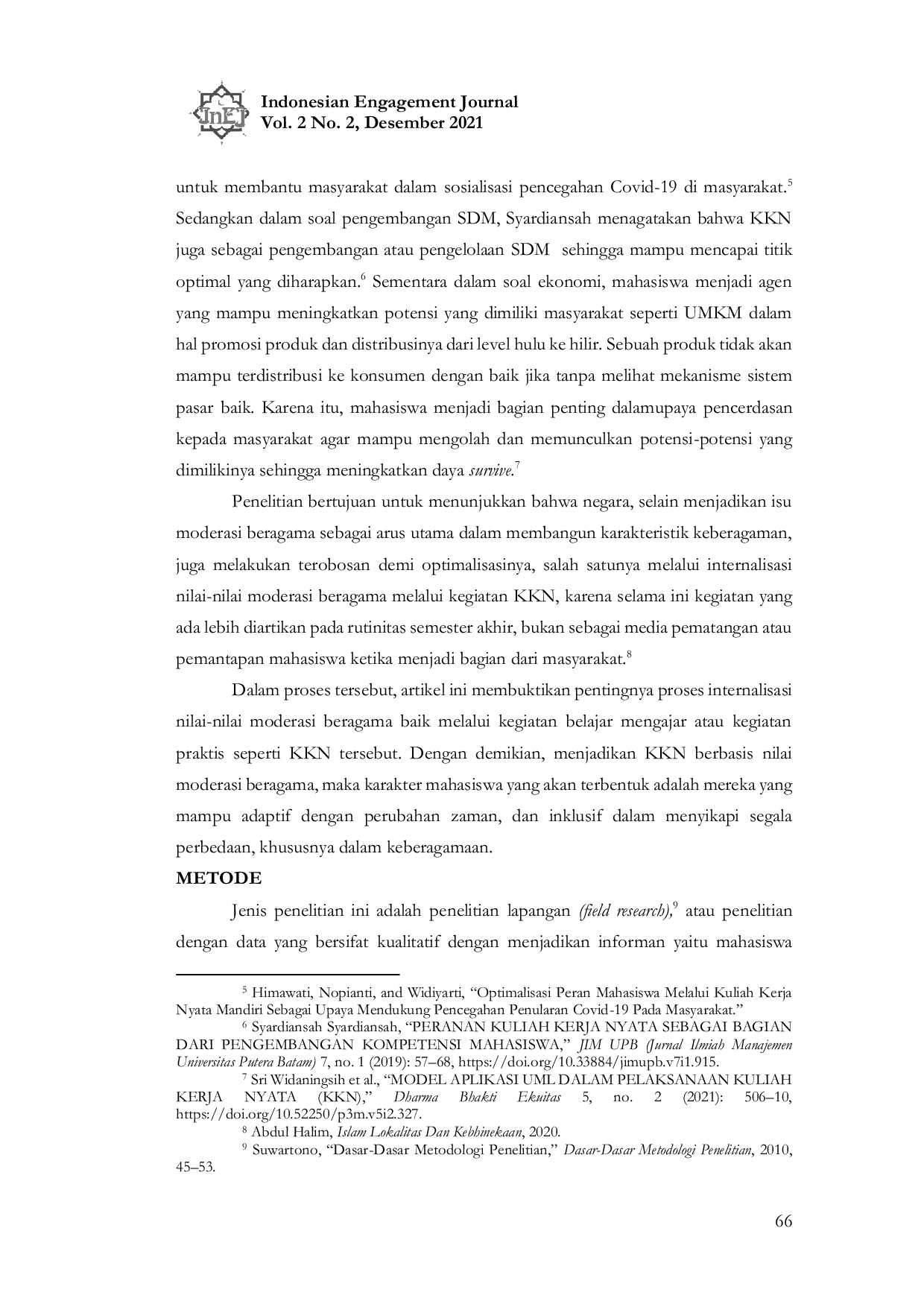 InEJ: Indonesian Engagement JournalInEJ: Indonesian Engagement JournalArtikel ini fokus mendiskusikan tentang bagaimana implementasi nilai-nilai moderasi ditanamkan melalui kegiatan akademik di ranah perguruan tinggi melalui kegiatan KKN. Studi ini bertujuan untuk menunjukkan bahwa negara, selain menjadikan isu moderasi beragama sebagai arus utama dalam membangun karakteristik keberagaman, juga melakukan terobosan demi optimalisasinya. Penelitian deskriptif ini didominasi oleh data field research yaitu wawancara dengan peserta KKN Nusantara Moderasi Beragama yang berhasil melakukan kegiatan pengabdian masyarakat di Mulyasari, Mowila, Kabupaten Konawe Selatan, Sulawesi Tenggara, juga diperkaya oleh data skunder berbentuk studi literatur. Hasil menunjukkan bahwa KKN Nusantara berbasis Moderasi Beragama yang dilakukan oleh peserta merupakan terobosan penyemaian nilai-nilai moderasi yang saat ini menjadi salah satu isu aktual di level Kementerian Agama di tengah maraknya isu intoleransi dan disintegrasi antar agama. Instrumen KKN sebagai media desseminasi nilai-nilai moderasi beragama memberi ruang baru bagi mahasiswa dalam memahami dinamika keberagamaan yang rawan dengan isu-isu intoleransi dewasa ini.