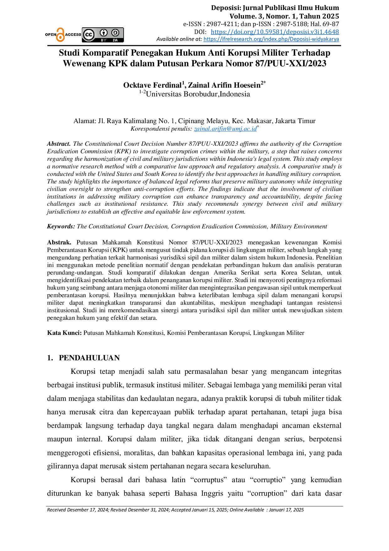 Deposisi: Jurnal Publikasi Ilmu HukumDeposisi: Jurnal Publikasi Ilmu HukumPutusan Mahkamah Konstitusi Nomor 87/PUU-XXI/2023 menegaskan kewenangan Komisi Pemberantasan Korupsi (KPK) untuk mengusut tindak pidana korupsi di lingkungan militer, sebuah langkah yang mengundang perhatian terkait harmonisasi yurisdiksi sipil dan militer dalam sistem hukum Indonesia. Penelitian ini menggunakan metode penelitian normatif dengan pendekatan perbandingan hukum dan analisis peraturan perundang-undangan. Studi komparatif dilakukan dengan Amerika Serikat serta Korea Selatan, untuk mengidentifikasi pendekatan terbaik dalam penanganan korupsi militer. Studi ini menyoroti pentingnya reformasi hukum yang seimbang antara menjaga otonomi militer dan mengintegrasikan pengawasan sipil untuk memperkuat pemberantasan korupsi. Hasilnya menunjukkan bahwa keterlibatan lembaga sipil dalam menangani korupsi militer dapat meningkatkan transparansi dan akuntabilitas, meskipun menghadapi tantangan resistensi institusional. Studi ini merekomendasikan sinergi antara yurisdiksi sipil dan militer untuk mewujudkan sistem penegakan hukum yang efektif dan setara.