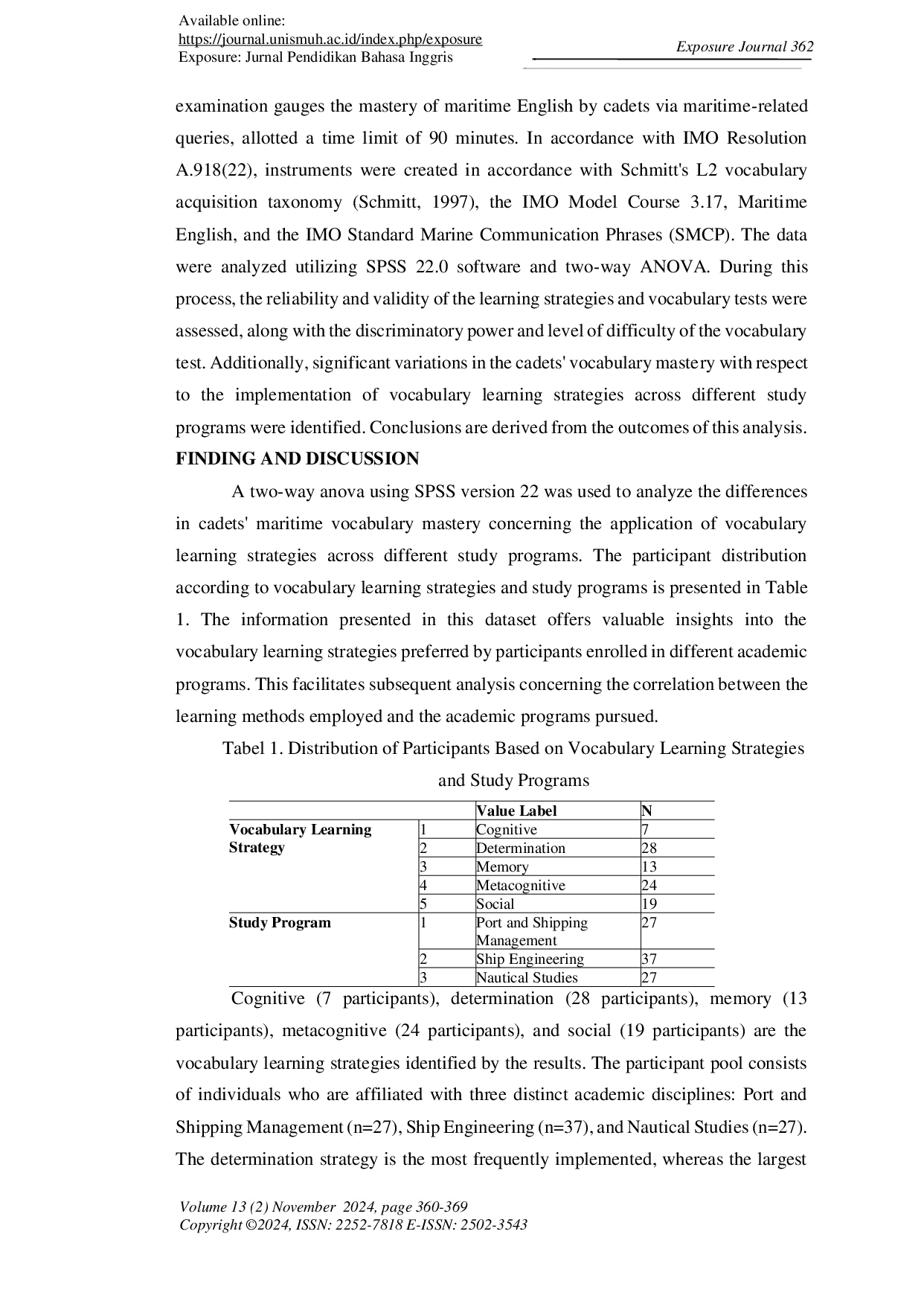 EXPOSURE : JURNAL PENDIDIKAN BAHASA INGGRISEXPOSURE : JURNAL PENDIDIKAN BAHASA INGGRISAkuisisi kosakata sangat penting bagi pelajar bahasa karena memengaruhi kecakapan linguistik secara keseluruhan dan kemampuan komunikasi. Penelitian ini menyelidiki pengaruh strategi belajar kosakata dan program studi terhadap hasil tes kosakata kadet maritim di Politeknik Merchant Sorong. Metode kuantitatif dengan desain eks‑post‑fakto melibatkan 91 kadet semester tiga dari tiga program studi (Manajemen Pelabuhan dan Pengiriman, Teknik Kapal, serta Studi Nautik). Data dikumpulkan melalui kuesioner strategi belajar kosakata dan tes kosakata berbasis konteks maritim, kemudian dianalisis dengan ANOVA dua arah. Hasil menunjukkan tidak ada perbedaan signifikan pada nilai tes antar program studi maupun strategi belajar, meskipun strategi penentuan paling populer; namun terdapat interaksi signifikan antara strategi belajar dan program studi yang dapat meningkatkan hasil tes secara lebih efektif. Penelitian selanjutnya disarankan mengeksplorasi faktor motivasi, kemahiran bahasa sebelumnya, dan dukungan lingkungan belajar untuk mengoptimalkan hasil belajar kosakata.