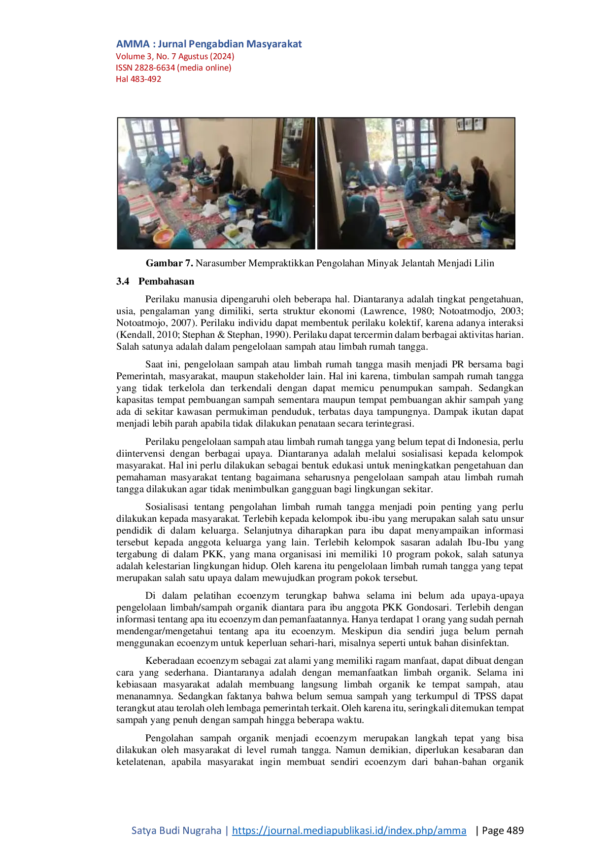AMMA : Jurnal Pengabdian MasyarakatAMMA : Jurnal Pengabdian MasyarakatLingkungan Gondosari yang berlokasi di Kelurahan Susukan, Kecamatan Ungaran Timur, Kabupaten Semarang memiliki permasalahan dalam mengelola limbah rumah tangga, yang berupa minyak goreng dan sisa makanan (buah/sayur). Hasil buangan limbah yang menumpuk pada Tempat Pembuangan Sampah Sementara (TPSS) menimbulkan bau busuk serta menghadirkan suasana dan pemandangan yang tidak menarik. Kegiatan pengabdian kepada masyarakat ini bertujuan untuk memberikan pelatihan kepada warga (khususnya Ibu-Ibu PKK) di Lingkungan Gondosari untuk meningkatkan pengetahuan dan pemahaman dalam pengolahan limbah rumah tangga (minyak goreng dan sisa buah/sayur). Metode yang diterapkan adalah melalui pelatihan pembuatan ecoenzym dari sisa buah, serta pelatihan pengolahan minyak jelantah menjadi sabun dan lilin. Hasil pelatihan adalah meningkatnya pengetahuan dan keterampilan dari kelompok Ibu-Ibu PKK untuk mengolah limbah rumah tangganya.