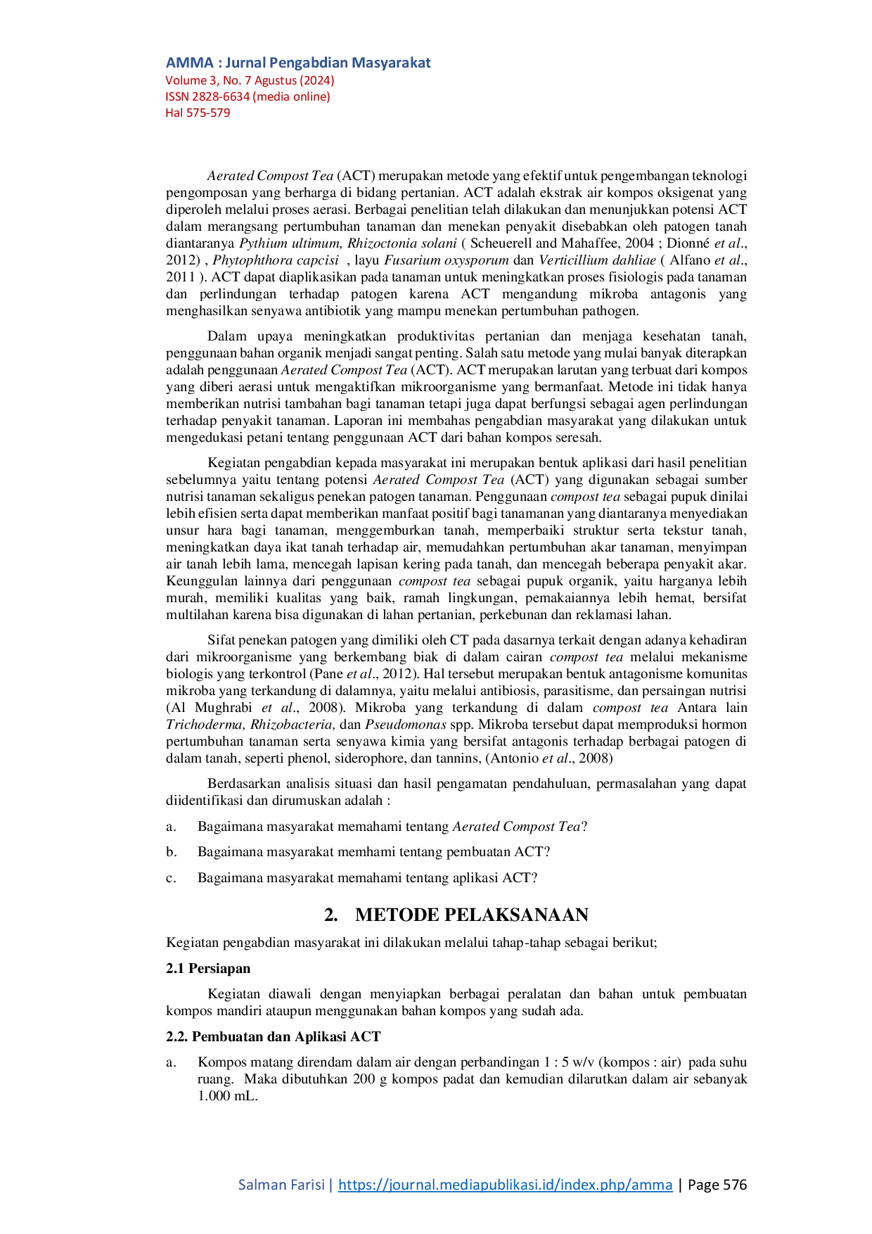 AMMA : Jurnal Pengabdian MasyarakatAMMA : Jurnal Pengabdian MasyarakatSalah satu produk teknologi pengomposan yang juga berkembang pesat adalah pembuatan compost tea (CT). CT merupakan ekstrak air kompos oksigenat yang diperoleh melalui proses penghawaan (aerasi) dalam fase cair. Proses pembuatan CT dengan metode tersebut dinamakan dengan Aerated Compost Tea (ACT). Kelebihan ACT dibandingkan dengan kompos biasa dikarenkan ekstrak air kompos mengandung nutrisi hara terlarut dan juga hormone pertumbuhan. Selain berfungsi sebagai sumber unsur hara, ACT juga dapat memperbaiki ekosistem tanah bagi pertumbuhan mikroba pengurai yang mampu mendukung kesuburan tanah, memperbaiki sifat fisik dan biologis tanah, memperbaiki aktivitas mikroba di dalamnya, dan juga dapat meningkatkan ketahanan tanaman terhadap pathogen. ACT menyediakan unsur hara terlarut yang lebih cepat untuk diserap tanaman dan pada saat yang bersamaan memberikan biopestisida untuk mencegah ataupun menghambat infeksi patogen penyebab penyakit tanaman. Kegiatan Pengabdian Keapada Masyarakat ini merupakan pengembangan IPTEK dari hasil hasil penelitian yang telah dilakukan. Hasil Pengabdian kepada Masyarakat memperlihatkan hasil yang cukup baik, yaitu ada kenaikan sebesar 33,35 % dari pemahaman awal. Hal ini cukup menarik karena pemahaman awal tentang ACT masih rendah yaitu 60,54. Penjelasan yang diberikan oleh tim Pengabdian Masyarakat ternyata dapat dipahami oleh khalayak sasaran dengan baik sehingga pemahaman mereka meningkat hingga 78,02.