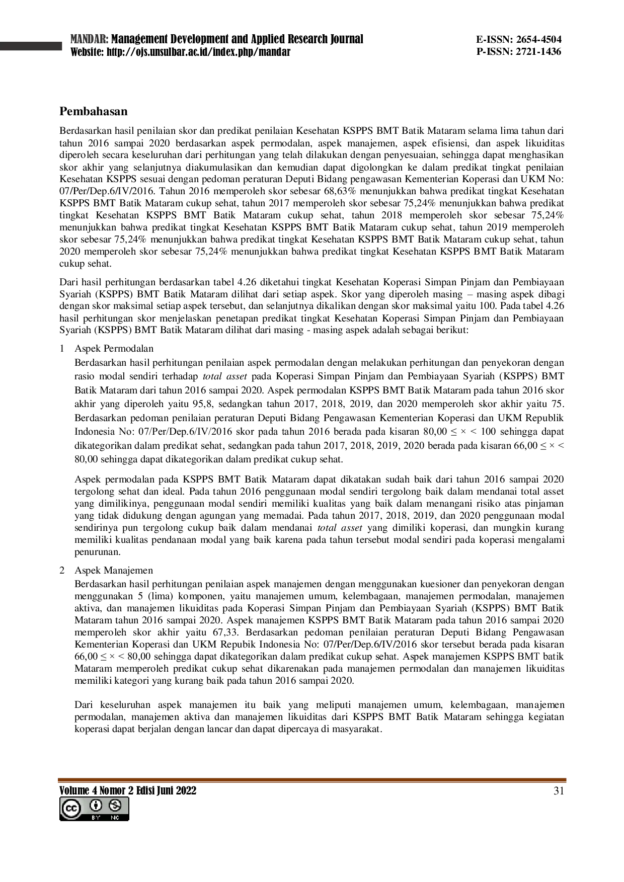 MANDAR: Management Development and Applied Research JournalMANDAR: Management Development and Applied Research JournalPenelitian ini bertujuan untuk mengetahui tingkat kesehatan koperasi simpan pinjam dan pembiayaan syariah BMT Batik Mataram ditinjau dari: aspek permodalan, aspek manajemen, aspek efisiensi dan aspek likuiditas. Penelitian ini merupakan jenis penelitian deskriptif kuantitatif. Subyek penelitian ini adalah koperasi simpan pinjam dan pembiayaan syariah BMT Batik Mataram di Yogyakarta. Objek penelitian ini adalah tingkat kesehatan koperasi. Metode pengumpulan data menggunakan dokumentasi dan angket. Perhitungan menggunakan teknik PAP berdasarkan Peraturan Deputi Bidang Pengawasan Kementerian Koperasi dan Usaha Kecil Menengah Republik Indonesia Nomor: 07/Per/Dep.06/IV/2016. Hasil penelitian menunjukkan bahwa kesehatan Tingkat Koperasi Simpan Pinjam BMT Batik Mataram (KSPPS) Yogyakarta dari tahun 2016 sampai dengan tahun 2020 memperoleh predikat masih cukup sehat dengan skor yang fluktuatif, hal ini juga dilihat dari: Aspek permodalan, aspek manajemen, aspek efisiensi, aspek likuiditas.