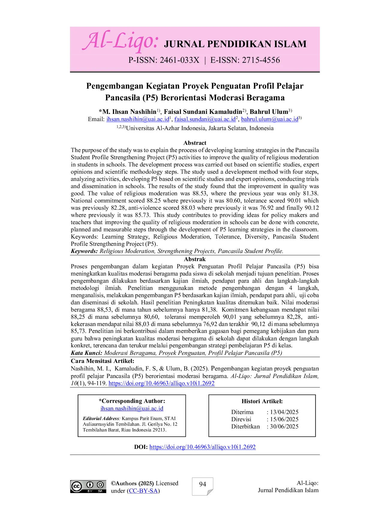 Al-Liqo: Jurnal Pendidikan IslamAl-Liqo: Jurnal Pendidikan IslamProses pengembangan dalam kegiatan Proyek Penguatan Profil Pelajar Pancasila (P5) bisa meningkatkan kualitas moderasi beragama pada siswa di sekolah menjadi tujuan penelitian. Proses pengembangan dilakukan berdasarkan kajian ilmiah, pendapat para ahli dan langkah-langkah metodologi langkah, menganalisis, melakukan pengembangan P5 berdasarkan kajian ilmiah, pendapat para ahli, uji coba dan diseminasi di sekolah. Hasil penelitian Peningkatan kualitas ditemukan baik. Nilai moderasi beragama 88,53, di mana tahun sebelumnya hanya 81,38. Komitmen kebangsaan 88,25 di mana sebelumnya 80,60, toleransi 90,01 yang sebelumnya 82,28, anti-kekerasan 88,03 dimana sebelumnya 76,92 dan terakhir 90,12 dimana sebelumnya 85,73. Penelitian ini berkontribusi dalam memberikan gagasan bagi pemegang kebijakan dan guru bahwa peningkatan kualitas moderasi beragama di sekolah dapat dilakukan dengan langkah konkret, terencana dan terukur melalui pengembangan strategi pembelajaran P5 di kelas.