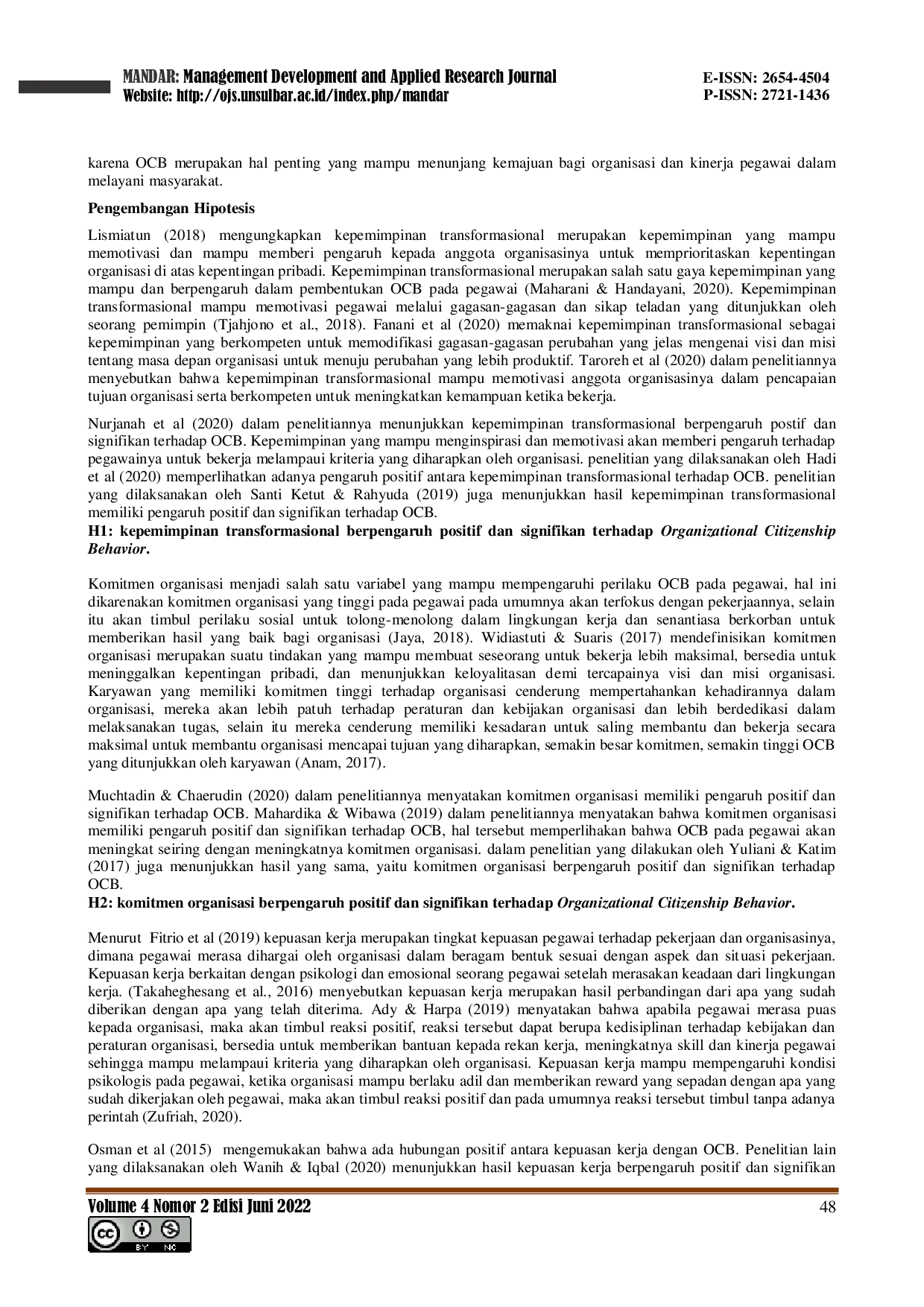 MANDAR: Management Development and Applied Research JournalMANDAR: Management Development and Applied Research JournalTujuan dari penelitian ini menguji pengaruh kepemimpinan transformasional, komitmen organisasi, dan kepuasan kerja terhadap organizational citizenship behavior (OCB). Populasi dalam penelitian ini menggunakan semua pegawai dan staff Kantor Kapanewon Panjatan yang berjumlah 50 orang. Teknik pengambilan sampel dilakukan secara non probability sampling dengan metode sampling jenuh. Metode pengumpulan data menggunakan kuesioner, sedangkan teknik analisis data menggunakan analisis regresi linear berganda. Hasil penelitian menunjukkan bahwa kepemimpinan transformasional berpengaruh positif dan signifikan terhadap organizational citizenship behavior, komitmen organisasi berpengaruh positif dan signifikan terhadap organizational citizenship behavior, dan kepuasan kerja berpengaruh positif dan signifikan terhadap organizational citizenship behavior (OCB). Penelitian diharapkan mampu meningkatkan perilaku OCB pada Kantor Kapanewon Panjatan.