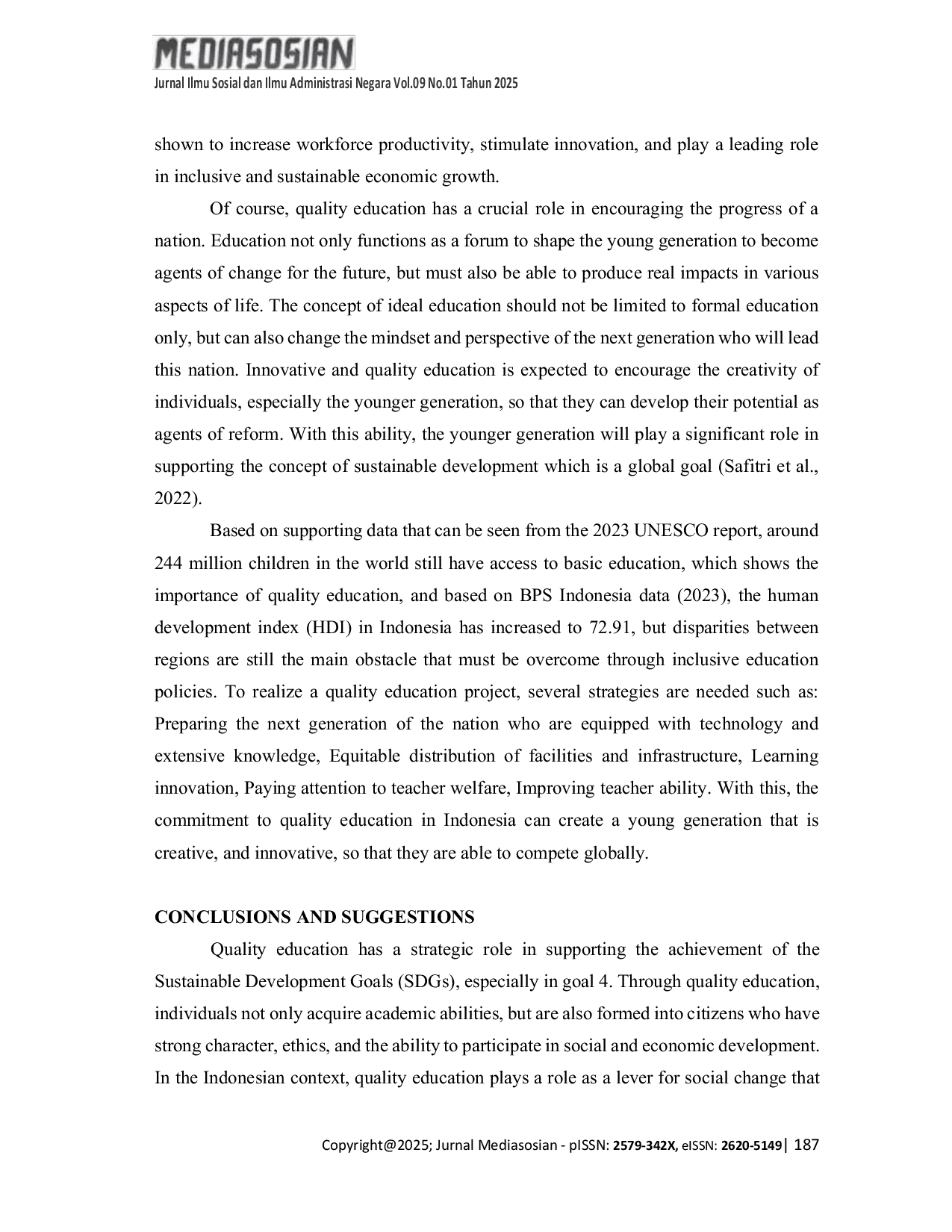 Jurnal Mediasosian : Jurnal Ilmu Sosial dan Administrasi NegaraJurnal Mediasosian : Jurnal Ilmu Sosial dan Administrasi NegaraPendidikan merupakan hak dasar yang sangat penting bagi keberlangsungan hidup manusia dan pembangunan suatu bangsa. Di Indonesia, pendidikan berkualitas memainkan peran krusial dalam mencapai Tujuan Pembangunan Berkelanjutan (SDGs), khususnya tujuan ke-4 yang menekankan pendidikan inklusif dan setara. Meskipun pemerintah telah mengeluarkan berbagai kebijakan untuk meningkatkan mutu pendidikan, tantangan yang dihadapi, seperti ketimpangan akses antara daerah perkotaan dan pedesaan, rendahnya kualitas guru, serta keterbatasan infrastruktur, terus menghambat progres tersebut. Penelitian ini bertujuan untuk menganalisis secara mendalam peran pendidikan berkualitas dalam mendukung pencapaian SDGs di Indonesia, serta mengidentifikasi tantangan utama dan kebijakan yang dibutuhkan untuk mencapai pendidikan yang merata dan berkelanjutan. Dengan menggunakan pendekatan tinjauan pustaka, penelitian ini menunjukkan bahwa pendidikan berkualitas memiliki peran strategis tidak hanya dalam peningkatan kapasitas akademik, tetapi juga dalam pembentukan karakter, pengentasan kemiskinan, dan penguatan ketahanan sosial. Oleh karena itu, perlu adanya kolaborasi lintas sektor dan kebijakan yang berpihak pada inklusivitas dan pemerataan akses pendidikan di seluruh wilayah Indonesia. Dengan komitmen yang kuat dan pendekatan yang terintegrasi, Indonesia memiliki potensi untuk menciptakan sistem pendidikan yang lebih baik, menghasilkan generasi yang terampil, kreatif, dan inovatif, serta siap menghadapi tantangan global serta berkontribusi pada pembangunan sosial dan ekonomi yang berkelanjutan.