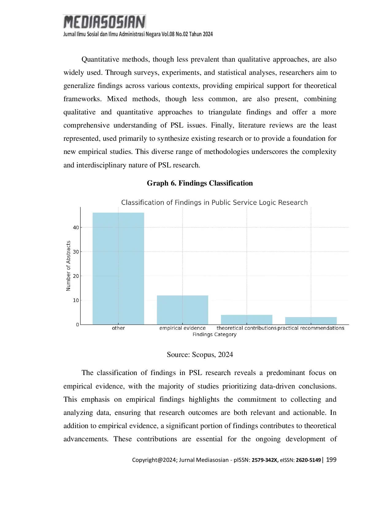 Analisis penelitian Logika Pelayanan Publik (LPP) menyoroti tren, kesenjangan, dan arah penelitian masa depan di bidang ini.Fluktuasi minat akademik, dengan puncak pada tahun 2021 dan perlambatan pada tahun 2022 dan 2023, menunjukkan kebutuhan akan pengembangan lebih lanjut dalam fondasi teoritis LPP.Distribusi luas publikasi di berbagai jurnal dan negara menunjukkan sifat interdisipliner dan global dari penelitian LPP, meskipun masih terkonsentrasi di Eropa, terutama Skandinavia, dengan keterlibatan relatif terbatas dari Asia dan Amerika Selatan.LPP sangat relevan dengan masyarakat kolektivis Indonesia, menawarkan potensi untuk meningkatkan partisipasi warga dan meningkatkan penyediaan layanan publik melalui penciptaan bersama.Dengan mengintegrasikan prinsip-prinsip LPP, Indonesia dapat mereformasi sektor publiknya untuk menjadi lebih responsif dan partisipatif, sejalan dengan upaya desentralisasi dan inovasi tata kelola.Analisis kata kunci mengungkapkan bahwa LPP bergeser menuju pendekatan yang lebih kolaboratif dan berorientasi nilai, dengan konsep seperti produksi bersama dan penciptaan nilai bersama menjadi sentral dalam diskursus.Temuan ini menunjukkan masa depan di mana layanan publik semakin dirancang bersama dengan komunitas yang dilayani.Secara metodologis, penelitian LPP menggunakan berbagai pendekatan, terutama metode kualitatif dan studi kasus, yang mencerminkan kompleksitas sistem layanan publik.Temuan penelitian seimbang antara bukti empiris, kontribusi teoritis, dan rekomendasi praktis, menunjukkan bahwa penelitian LPP tidak hanya maju dalam pemahaman akademik tetapi juga menawarkan wawasan yang dapat diterapkan untuk praktisi.