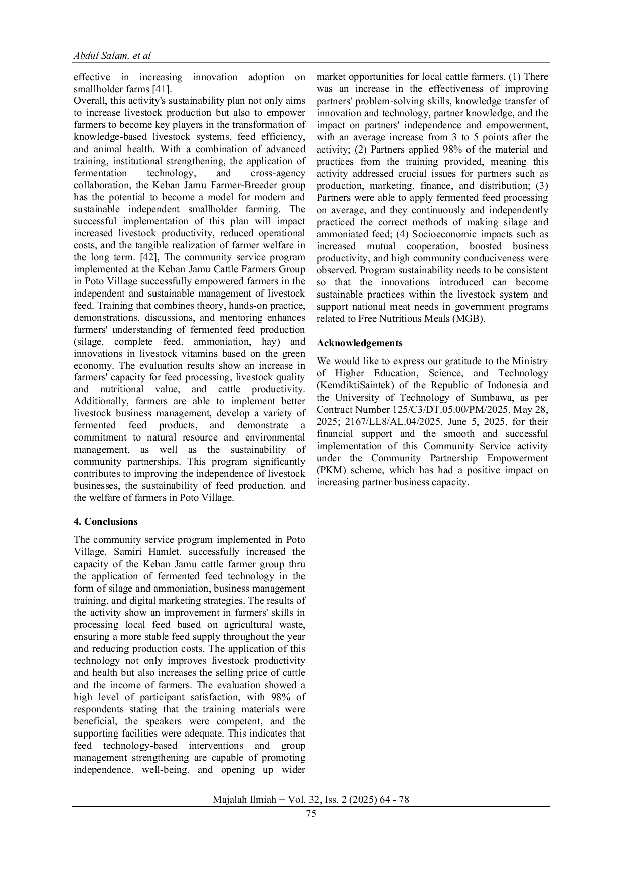 Program pemberdayaan masyarakat yang dilaksanakan di Desa Poto, Dusun Samiri, berhasil meningkatkan kapasitas kelompok peternak Keban Jamu melalui penerapan teknologi pakan fermentasi (silase dan amoniasi), pelatihan manajemen usaha, serta strategi pemasaran digital.Hasil menunjukkan peningkatan keterampilan pengolahan pakan lokal, stabilitas pasokan pakan sepanjang tahun, penurunan biaya produksi, serta peningkatan produktivitas, kesehatan ternak, harga jual, dan pendapatan petani.Evaluasi mengungkapkan tingkat kepuasan peserta yang tinggi (98%), menandakan bahwa intervensi pakan dan penguatan manajemen kelompok dapat memajukan kemandirian, kesejahteraan, dan membuka peluang pasar yang lebih luas.