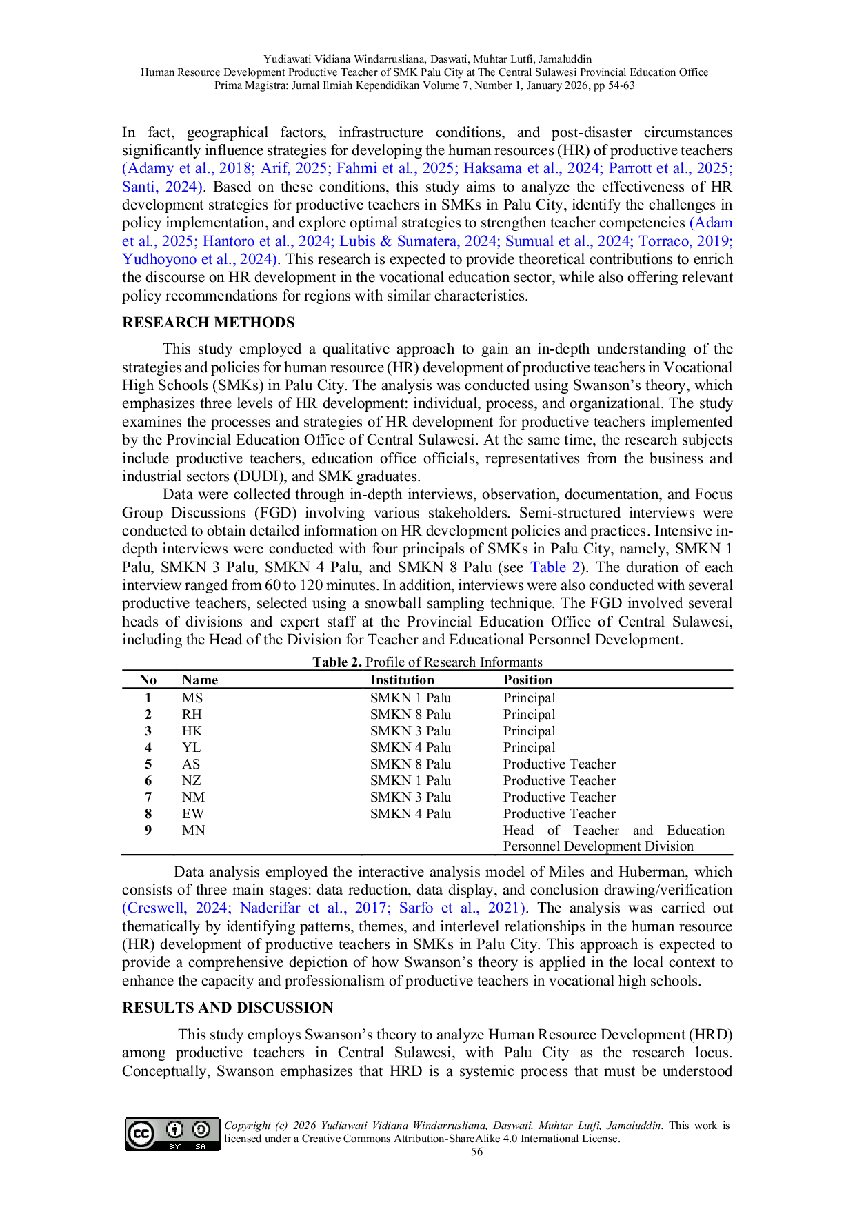 Prima Magistra: Jurnal Ilmiah KependidikanPrima Magistra: Jurnal Ilmiah KependidikanThis study originates from the issue of weak human resource development (HRD) among productive teachers in Palu City, characterized by an imbalance between the number of productive teachers and the ideal needs, resulting in a heavy workload that diminishes motivation for self-development. The comfortable status of teachers as civil servants and their financial stability through regular salaries and professional allowances further weaken both internal and external incentives to improve competencies. In contrast, the absence of economic incentives, rewards, or sanctions related to professional development activities reduces teachers commitment to responding to the evolving demands of vocational education. The study aims to analyze HRD among productive teachers using Swansons theoretical framework, which consists of three levels of analysis: individual, process, and organizational. A qualitative approach is employed to understand how individual motivation, capacity, readiness to develop, learning processes, and organizational policies influence teachers competency development. The findings indicate that the application of Swansons framework has not operated effectively due to fundamental weaknesses at the individual level, which hinder the optimal functioning of learning processes and organizational support. Overall, HRD among productive teachers in Palu City has not aligned with Swansons principles, highlighting the need for policy interventions in teacher staffing, strengthened professional development incentives, and the cultivation of an organizational culture that promotes continuous learning.