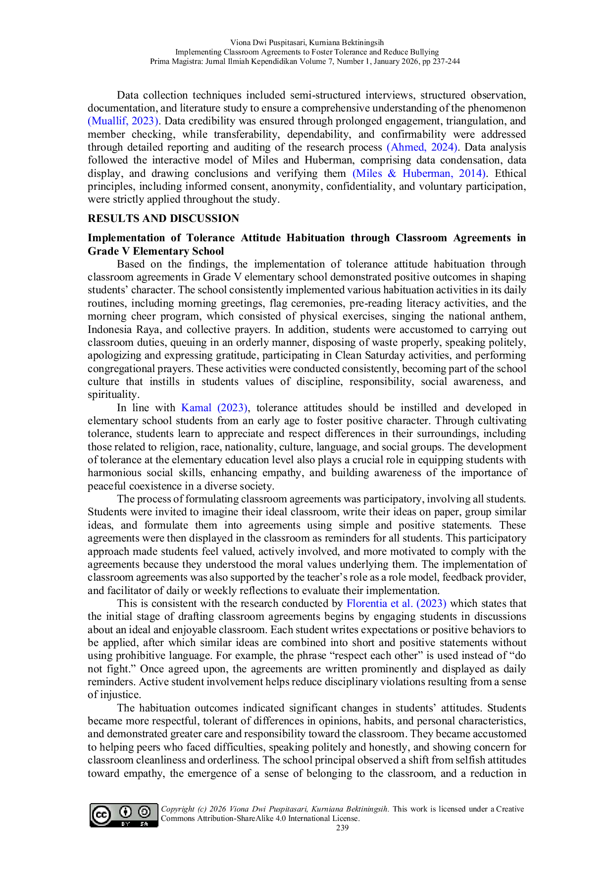 Implementasi kebiasaan toleransi melalui kesepakatan kelas di SD Negeri Sukorejo 01 telah berkontribusi signifikan dalam membentuk karakter siswa dan menciptakan lingkungan kelas yang lebih kondusif.Kesepakatan kelas berfungsi sebagai pedoman perilaku sekaligus media internalisasi nilai toleransi seperti saling menghormati dan menghargai perbedaan.Meskipun demikian, perilaku perundungan masih teridentifikasi, terutama berupa perundungan verbal dan sosial yang berkaitan dengan rendahnya tingkat toleransi siswa.Efektivitas kesepakatan kelas bergantung pada bimbingan guru yang konsisten, peran model, dan implementasi yang terus-menerus untuk memastikan internalisasi nilai toleransi dan pengurangan perundungan secara berkelanjutan.