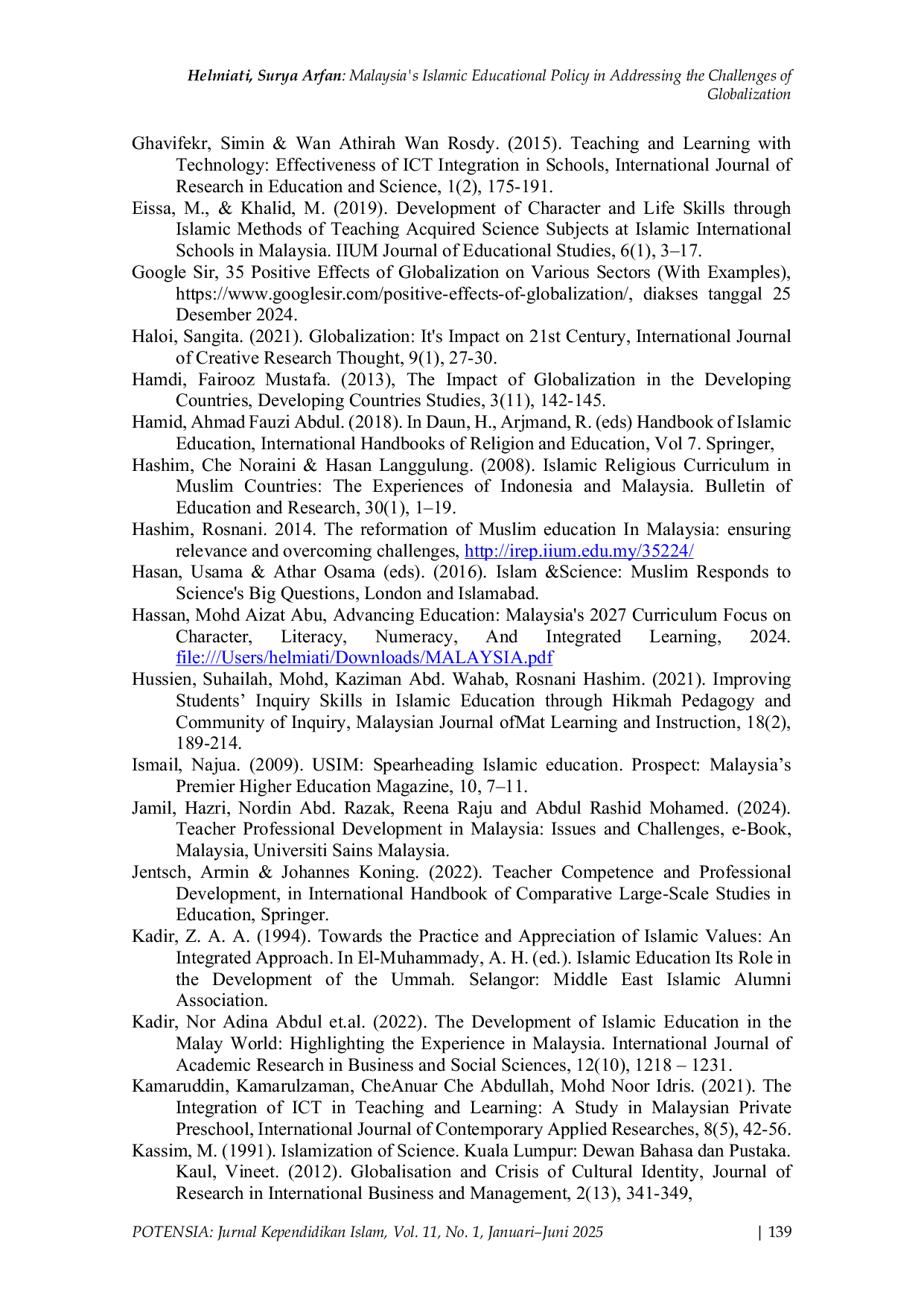 POTENSIA: Jurnal Kependidikan IslamPOTENSIA: Jurnal Kependidikan IslamGlobalisasi menghadirkan tantangan dan peluang bagi pendidikan Islam. Artikel ini bertujuan untuk mengkaji kebijakan pendidikan Islam di Malaysia dalam menghadapi tantangan dan peluang globalisasi dan menganalisisnya berdasarkan perspektif para ahli. Studi literatur dengan pendekatan kualitatif digunakan untuk menganalisis dokumen kebijakan dan pandangan para ahli dan peneliti pendidikan Islam. Hasil penelitian menunjukkan bahwa di antara kebijakan pendidikan Malaysia untuk memperkuat pendidikan Islam adalah reformasi kurikulum, integrasi sains dan Islam dalam kurikulum, penekanan pada pendidikan karakter, pengembangan profesionalisme guru, integrasi teknologi informasi dan komunikasi dalam pendidikan, peningkatan kualitas kepemimpinan dan manajemen sekolah, dan pengembangan pendidikan tinggi Islam. Kebijakan-kebijakan tersebut dimaksudkan untuk menciptakan keseimbangan antara mempertahankan identitas dan pengamalan Islam dengan pembangunan negara sesuai tuntutan globalisasi. Dengan langkah-langkah strategis tersebut, generasi muda diharapkan dapat bersaing di tingkat nasional dan internasional dengan karakter kebangsaan yang kuat tanpa kehilangan nilai-nilai fundamental. Kebijakan pendidikan Islam di Malaysia menunjukkan upaya adaptif terhadap tantangan globalisasi.