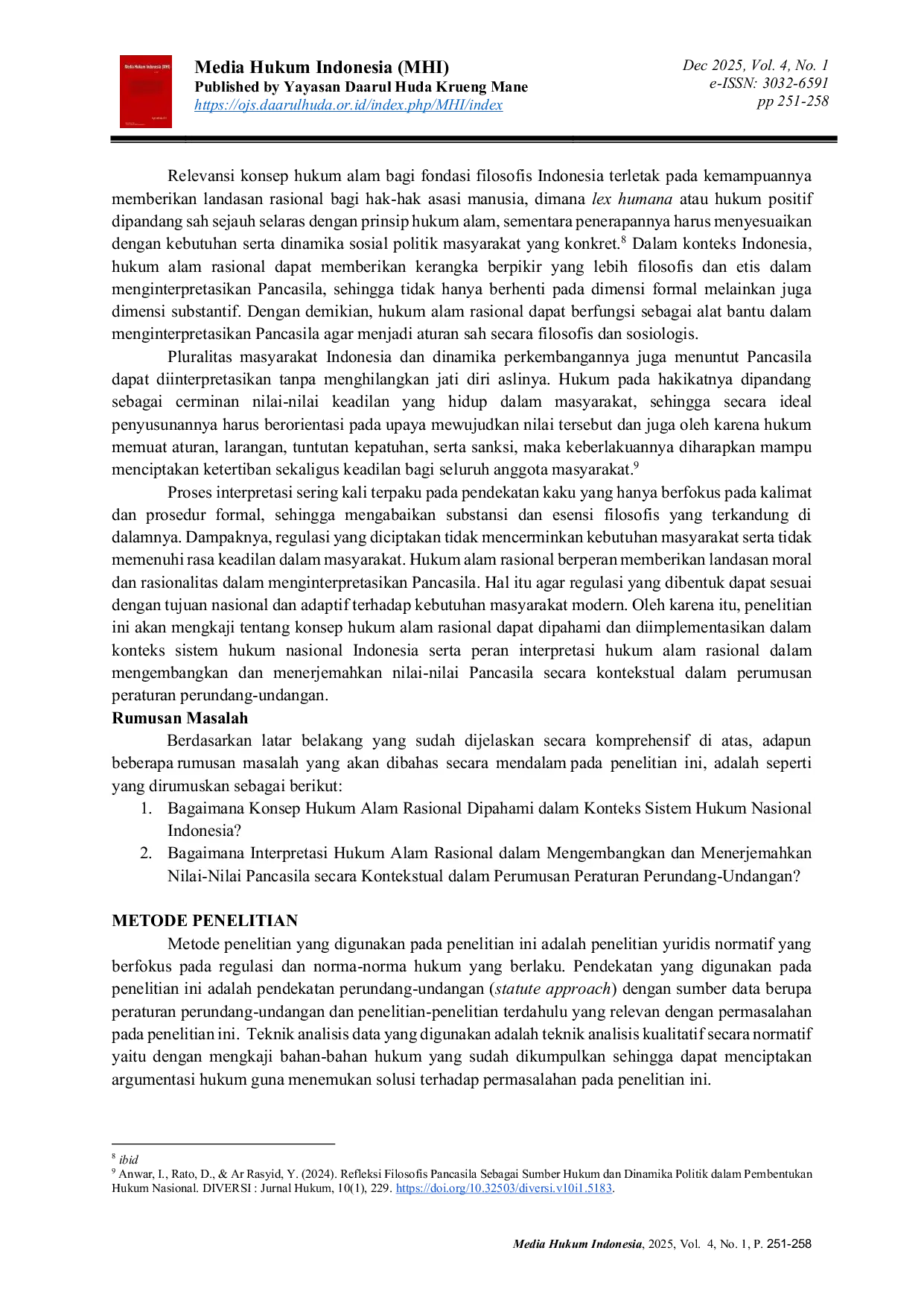Media Hukum Indonesia (MHI)Media Hukum Indonesia (MHI)Pancasila sebagai sumber dari segala sumber hukum memiliki kedudukan sentral dalam sistem hukum nasional Indonesia. Namun, tantangan utama yang dihadapi adalah bagaimana menerjemahkan nilai-nilai Pancasila yang bersifat abstrak ke dalam norma hukum positif yang konkret dan operasional. Penelitian ini mengkaji relevansi konsep hukum alam rasional sebagai pendekatan filosofis dalam menginterpretasikan Pancasila secara kontekstual dalam pembentukan peraturan perundang-undangan. Hukum alam rasional menekankan pentingnya akal budi dan nilai moral universal sebagai dasar pembentukan hukum, sehingga hukum tidak hanya sah secara formal, tetapi juga adil secara substansial. Dalam konteks Indonesia, nilai-nilai Pancasila seperti keadilan sosial, kemanusiaan yang adil dan beradab, serta musyawarah, memiliki kesesuaian dengan prinsip-prinsip hukum alam rasional. Melalui pendekatan ini, nilai-nilai Pancasila dapat ditransformasikan menjadi asas-asas hukum yang relevan dengan kebutuhan masyarakat modern, seperti asas proporsionalitas, keseimbangan kepentingan, dan perlindungan hak kodrati. Penelitian ini menggunakan metode yuridis normatif dengan pendekatan perundang-undangan dan analisis kualitatif terhadap regulasi serta putusan pengadilan yang mencerminkan penerapan prinsip hukum alam rasional. Hasil kajian menunjukkan bahwa interpretasi hukum alam rasional terhadap Pancasila berperan sebagai jembatan antara nilai filosofis dan norma hukum positif, sekaligus sebagai filter terhadap pengaruh global agar hukum nasional tetap mencerminkan identitas bangsa.
