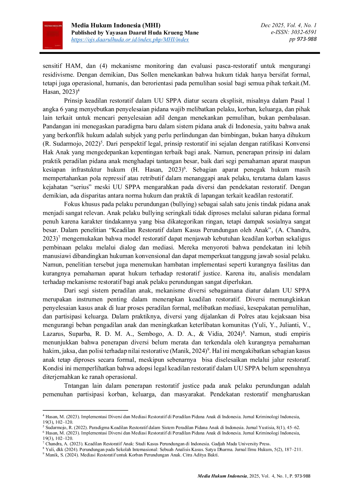 Media Hukum Indonesia (MHI)Media Hukum Indonesia (MHI)Penelitian ini bertujuan untuk menganalisis prinsip keadilan restoratif yang diterapkan oleh aparat penegak hukum terhadap anak sebagai pelaku perundungan berdasarkan Pasal 7 dan Pasal 9 Undang-Undang Nomor 11 Tahun 2012 tentang Sistem Peradilan Pidana Anak, serta mengkaji proses pembinaan yang efektif dalam mencegah pengulangan perbuatan perundungan dari perspektif kriminologi restoratif. Penelitian ini adalah penelitian kualitatif dengan pendekatan yuridis normatif. Desain penelitian ini merupakan penelitian kepustakaan yang menelaah peraturan perundang-undangan, doktrin hukum, dan literatur ilmiah yang relevan dengan keadilan restoratif dan sistem peradilan pidana anak. Hasil penelitian menunjukkan bahwa prinsip keadilan restoratif dalam Undang-Undang Nomor 11 Tahun 2012 diwujudkan melalui mekanisme diversi dalam Pasal 7 dan pelibatan masyarakat dalam Pasal 9 yang bertujuan memulihkan hubungan antara anak pelaku perundungan, korban, dan lingkungan sosial. Ketentuan tersebut menegaskan orientasi sistem peradilan pidana anak pada penyelesaian perkara yang non-represif dan partisipatif, namun masih bersifat normatif dan prosedural tanpa indikator pemulihan yang jelas. Lebih lanjut, penelitian ini menemukan bahwa penerapan Pasal 7 dan Pasal 9 belum sepenuhnya sejalan dengan prinsip keadilan restoratif karena tidak menjamin keseimbangan posisi korban dan pelaku, serta minim mekanisme evaluasi dan pengawasan atas keberlanjutan pemulihan. Oleh karena itu, diperlukan penguatan pengaturan dan pedoman penerapan keadilan restoratif yang lebih substantif agar pertanggungjawaban pidana anak pelaku perundungan benar-benar berorientasi pada pemulihan dan pencegahan pengulangan tindak pidana.