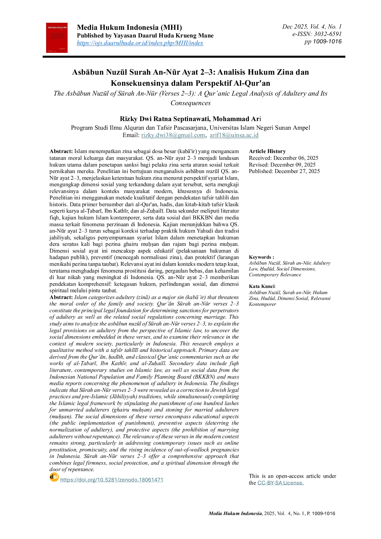 Media Hukum Indonesia (MHI)Media Hukum Indonesia (MHI)Islam menempatkan zina sebagai dosa besar (kabāir) yang mengancam tatanan moral keluarga dan masyarakat. QS. an‑Nūr ayat 2–3 menjadi landasan hukum utama dalam penetapan sanksi bagi pelaku zina serta aturan sosial terkait pernikahan mereka. Penelitian ini bertujuan menganalisis asbābun nuzūl QS. an‑Nūr ayat 2–3, menjelaskan ketentuan hukum zina menurut perspektif syariat Islam, mengungkap dimensi sosial yang terkandung dalam ayat tersebut, serta mengkaji relevansinya dalam konteks masyarakat modern, khususnya di Indonesia.