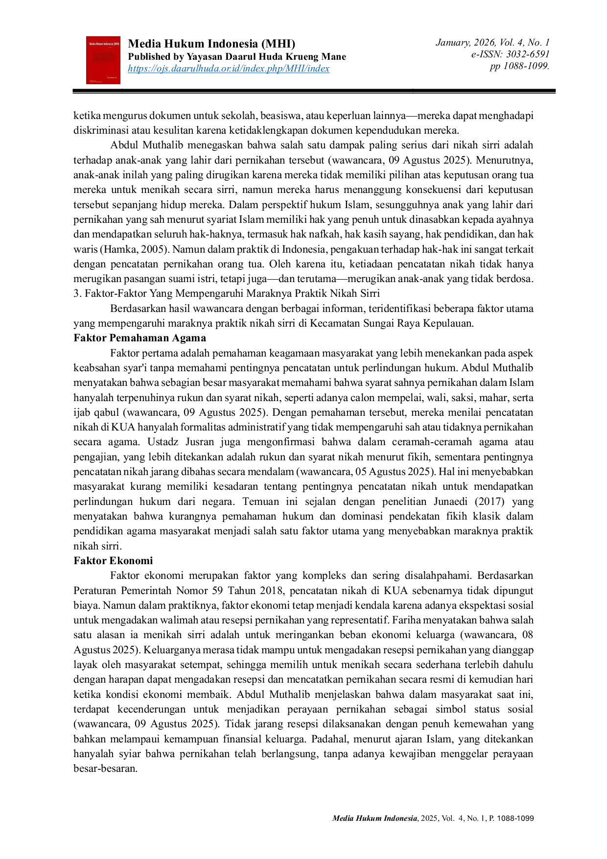 Media Hukum Indonesia (MHI)Media Hukum Indonesia (MHI)Nikah sirri merupakan fenomena sosial yang masih marak terjadi di Kecamatan Sungai Raya Kepulauan, Kabupaten Bengkayang. Praktik ini dianggap sah secara agama karena memenuhi rukun dan syarat nikah, namun tidak tercatat secara resmi di Kantor Urusan Agama (KUA). Penelitian ini bertujuan untuk menganalisis pandangan hukum Islam terhadap pencatatan nikah sirri, mengidentifikasi dampaknya terhadap hak-hak perempuan dan anak, serta mengevaluasi faktor-faktor yang mempengaruhi maraknya praktik ini. Penelitian menggunakan metode kualitatif dengan pendekatan deskriptif-analitis. Data dikumpulkan melalui wawancara mendalam dengan pasangan pelaku nikah sirri, tokoh agama, kepala KUA, dan masyarakat setempat. Hasil penelitian menunjukkan bahwa dalam perspektif hukum Islam, nikah sirri dianggap sah apabila rukun dan syaratnya terpenuhi, namun pencatatan pernikahan sangat penting sebagai bentuk maslahah mursalah untuk melindungi hak‑hak keluarga. Dampak negatif meliputi ketidakpastian status hukum istri dan anak, kesulitan memperoleh hak waris, serta minimnya perlindungan hukum. Faktor pendorong praktik nikah sirri antara lain aspek ekonomi, rendahnya pemahaman hukum, pengaruh budaya lokal, dan keterbatasan akses terhadap pencatatan resmi.