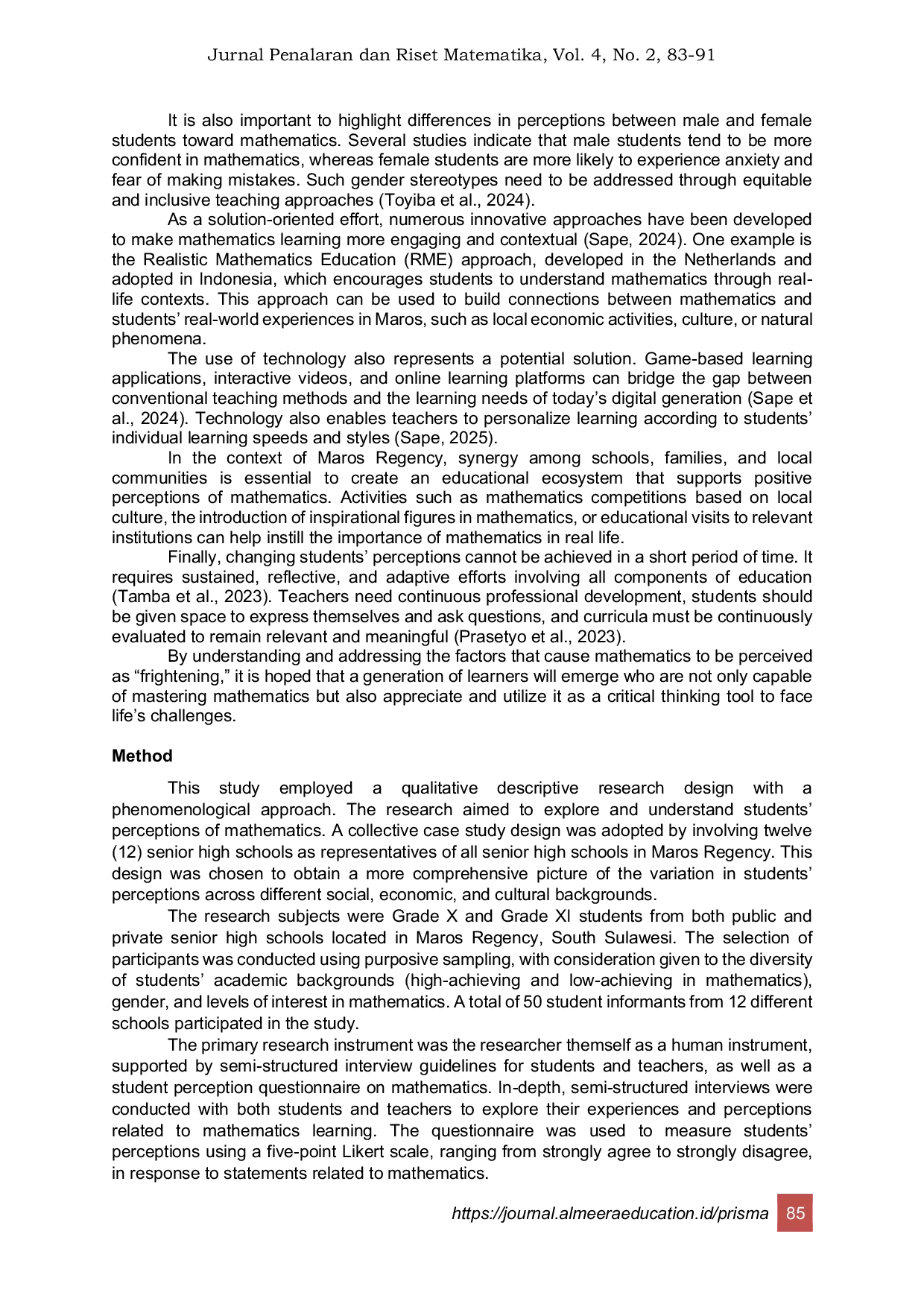 Jurnal Penalaran dan Riset MatematikaJurnal Penalaran dan Riset MatematikaStudi ini bertujuan untuk mengeksplorasi persepsi siswa terhadap matematika sebagai mata pelajaran yang menakutkan serta mengidentifikasi faktor-faktor yang memengaruhi persepsi tersebut. Penelitian dilakukan di sekolah menengah atas di Kabupaten Maros, Sulawesi Selatan, menggunakan pendekatan mixed-methods. Data dikumpulkan secara kuantitatif untuk mengukur persepsi siswa dan melalui wawancara semi-struktural dengan siswa serta guru untuk menggali wawasan kualitatif. Hasil penelitian menunjukkan bahwa sebagian besar siswa memiliki persepsi negatif terhadap matematika, ditandai oleh kecemasan, stres, dan kurangnya kepercayaan diri dalam belajar. Faktor-faktor penyebab termasuk metode pengajaran yang monoton, tekanan dari guru dan lingkungan sekolah, serta pengalaman belajar yang tidak menyenangkan. Guru juga mengakui tantangan dalam mengubah persepsi siswa karena keterbatasan waktu instruksional dan tekanan kurikulum. Studi ini merekomendasikan penerapan pendekatan pembelajaran yang lebih kontekstual, menyenangkan, dan berpusat pada siswa untuk mengubah persepsi negatif menjadi positif. Temuan ini memberikan masukan berharga bagi pembuat kebijakan, pendidik, dan pengembang kurikulum dalam merancang instruksi matematika yang lebih ramah siswa dan berfokus pada pengalaman belajar yang bermakna.