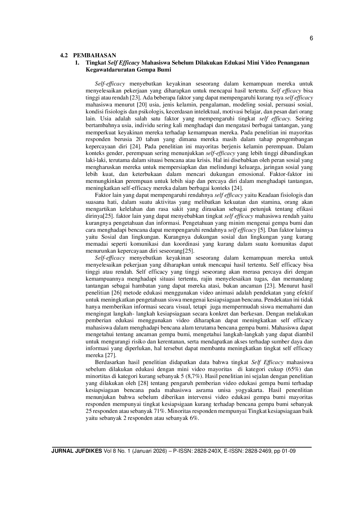 Sebelum pemberian edukasi video penanganan kegawatdaruratan gempa bumi, mayoritas responden memiliki tingkat self-efficacy yang cukup (65%), dengan sebagian kecil (8,7%) berada pada kategori rendah.Setelah diberikan edukasi tersebut, terjadi peningkatan signifikan, di mana seluruh responden (100%) menunjukkan tingkat self-efficacy yang baik.Oleh karena itu, dapat disimpulkan bahwa pemberian mini video edukasi penanganan kegawatdaruratan gempa bumi memiliki pengaruh signifikan terhadap self-efficacy mahasiswa keperawatan anestesiologi, sebagaimana dibuktikan oleh hasil uji Wilcoxon (p < 0.