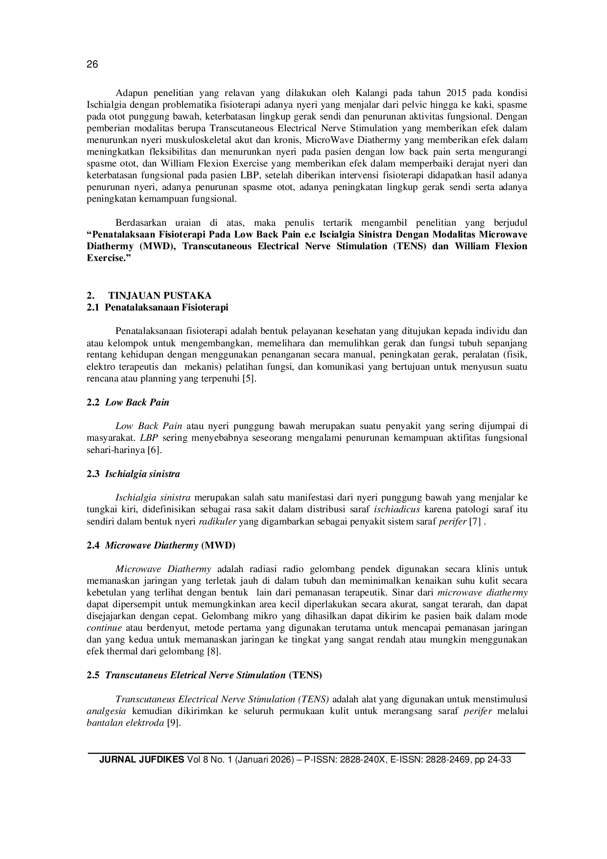 Penelitian ini menyimpulkan bahwa intervensi fisioterapi menggunakan modalitas microwave diathermy (MWD), transcutaneous electrical nerve stimulation (TENS), dan William flexion exercise efektif dalam menurunkan nyeri dan meningkatkan kemampuan aktivitas fungsional pasien dengan low back pain e.Hasil terapi menunjukkan penurunan nyeri, peningkatan fleksibilitas dan kekuatan otot, serta peningkatan aktivitas fungsional pasien.Keberhasilan terapi juga membutuhkan kerja sama antara pasien dan fisioterapis.