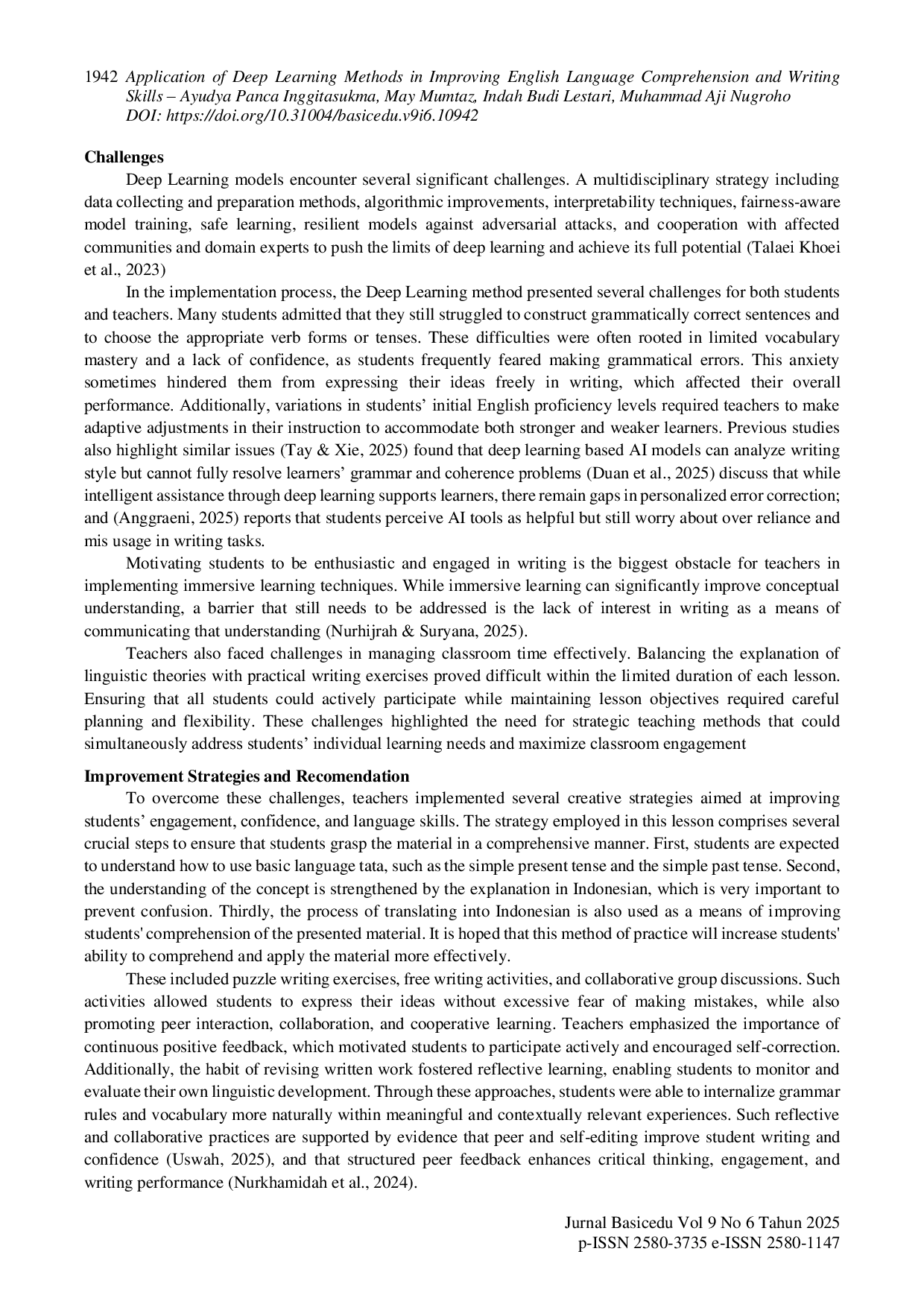 Jurnal BasiceduJurnal BasiceduPenelitian ini bertujuan untuk menganalisis implementasi metode Deep Learning dalam meningkatkan pemahaman dan keterampilan menulis Bahasa Inggris di SMK Negeri Tengaran. Metode penelitian yang digunakan adalah kualitatif-deskriptif dengan teknik pengumpulan data melalui observasi, wawancara, dan dokumentasi selama kegiatan Merdeka Belajar Kampus Merdeka (MBKM). Hasil penelitian menunjukkan bahwa penerapan metode Deep Learning mampu menciptakan suasana belajar yang lebih aktif, interaktif, dan kontekstual. Siswa tidak hanya menghafal struktur bahasa, tetapi juga memahami makna dan konteks penulisan melalui keterlibatan langsung dalam kegiatan menulis yang relevan dengan kehidupan sehari-hari. Pendekatan ini membantu meningkatkan kepercayaan diri, motivasi, serta kemampuan berpikir kritis dan reflektif siswa. Meskipun demikian, masih terdapat tantangan seperti keterbatasan kosakata, kesulitan dalam grammar, dan penyusunan kalimat kompleks. Untuk mengatasi hal tersebut, guru menggunakan strategi kreatif seperti puzzle writing dan free writing, serta memberikan umpan balik yang konstruktif. Hasil penelitian ini menegaskan bahwa metode Deep Learning berpotensi besar untuk diterapkan dalam pembelajaran menulis Bahasa Inggris guna meningkatkan literasi dan kompetensi abad ke-21.