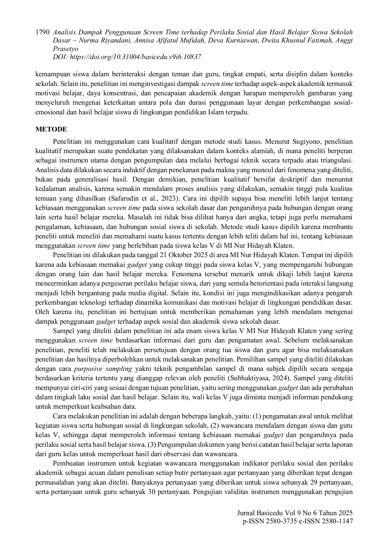 Jurnal BasiceduJurnal BasiceduKemajuan teknologi digital telah mengubah cara anak usia sekolah dasar berinteraksi dan belajar, termasuk di lingkungan madrasah ibtidaiyah. Penelitian ini bertujuan menganalisis secara mendalam pengaruh screen time terhadap perilaku sosial dan hasil belajar siswa kelas V MI Nur Hidayah Klaten. Penelitian dilakukan dengan pendekatan kualitatif melalui metode studi kasus, melibatkan enam siswa serta satu guru kelas sebagai informan utama. Data dikumpulkan melalui observasi, wawancara mendalam, dan dokumentasi, kemudian dianalisis dengan model interaktif Miles dan Huberman melalui tahapan reduksi, penyajian, dan verifikasi data. Hasil penelitian menunjukkan bahwa penggunaan gadget secara proporsional berkontribusi positif terhadap penguatan empati, komunikasi sosial, dan motivasi belajar. Sebaliknya, durasi penggunaan yang berlebihan berdampak negatif pada interaksi sosial, pengendalian emosi, konsentrasi, serta kedisiplinan belajar. Kebaruan penelitian ini terletak pada analisis kontekstual yang secara khusus menyoroti siswa madrasah ibtidaiyah dengan fokus pada keseimbangan antara pembentukan perilaku sosial-religius dan literasi digital anak. Secara teoretis, studi ini memperluas penerapan teori perkembangan sosial Piaget dan konsep self-regulation Bandura dalam konteks pendidikan Islam dasar. Secara praktis, temuan ini memberikan landasan bagi sekolah dan pembuat kebijakan untuk merumuskan pedoman penggunaan teknologi digital yang seimbang, adaptif, dan berorientasi pada penguatan karakter sosial serta kedisiplinan belajar anak di era digital.