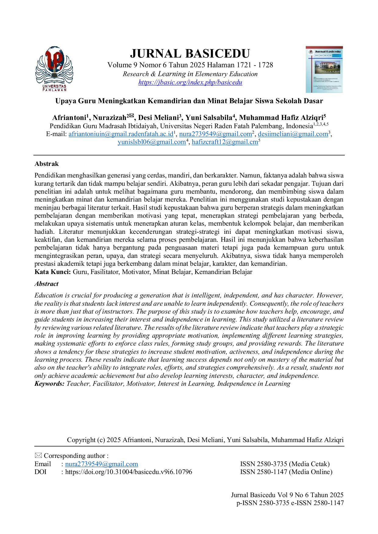 Jurnal BasiceduJurnal BasiceduPendidikan bertujuan menghasilkan generasi yang cerdas, mandiri, dan berkarakter. Namun, siswa seringkali kurang tertarik dan kesulitan belajar mandiri, sehingga peran guru melampaui sekadar pengajar. Penelitian ini bertujuan untuk memahami bagaimana guru membantu, mendorong, dan membimbing siswa dalam meningkatkan minat dan kemandirian belajar mereka. Penelitian ini menggunakan studi kepustakaan dengan meninjau berbagai literatur terkait. Hasil studi menunjukkan bahwa guru berperan strategis dalam meningkatkan pembelajaran melalui motivasi yang tepat, strategi pembelajaran yang beragam, penegakan aturan kelas yang sistematis, pembentukan kelompok belajar, dan pemberian penghargaan. Strategi-strategi ini cenderung meningkatkan motivasi, keaktifan, dan kemandirian siswa selama proses pembelajaran. Keberhasilan pembelajaran tidak hanya bergantung pada penguasaan materi, tetapi juga pada kemampuan guru untuk mengintegrasikan peran, upaya, dan strategi secara komprehensif, sehingga siswa tidak hanya meraih prestasi akademik tetapi juga mengembangkan minat belajar, karakter, dan kemandirian.