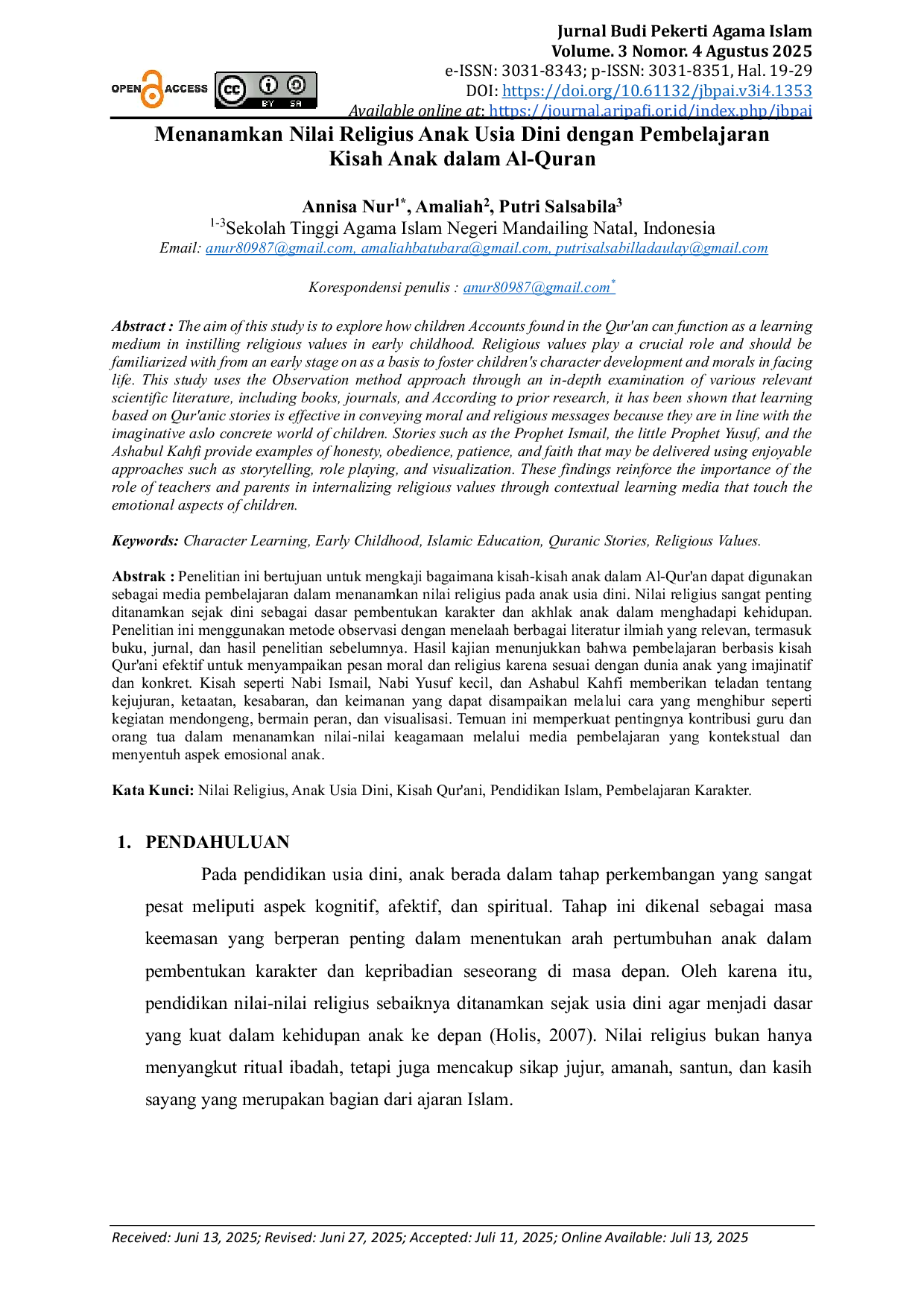 Jurnal Budi Pekerti Agama IslamJurnal Budi Pekerti Agama IslamPenelitian ini bertujuan untuk mengkaji bagaimana kisah-kisah anak dalam Al-Quran dapat digunakan sebagai media pembelajaran dalam menanamkan nilai religius pada anak usia dini. Nilai religius sangat penting ditanamkan sejak dini sebagai dasar pembentukan karakter dan akhlak anak dalam menghadapi kehidupan. Penelitian ini menggunakan metode observasi dengan menelaah berbagai literatur ilmiah yang relevan, termasuk buku, jurnal, dan hasil penelitian sebelumnya. Hasil kajian menunjukkan bahwa pembelajaran berbasis kisah Qurani efektif untuk menyampaikan pesan moral dan religius karena sesuai dengan dunia anak yang imajinatif dan konkret. Kisah seperti Nabi Ismail, Nabi Yusuf kecil, dan Ashabul Kahfi memberikan teladan tentang kejujuran, ketaatan, kesabaran, dan keimanan yang dapat disampaikan melalui cara yang menghibur seperti kegiatan mendongeng, bermain peran, dan visualisasi. Temuan ini memperkuat pentingnya kontribusi guru dan orang tua dalam menanamkan nilai-nilai keagamaan melalui media pembelajaran yang kontekstual dan menyentuh aspek emosional anak.