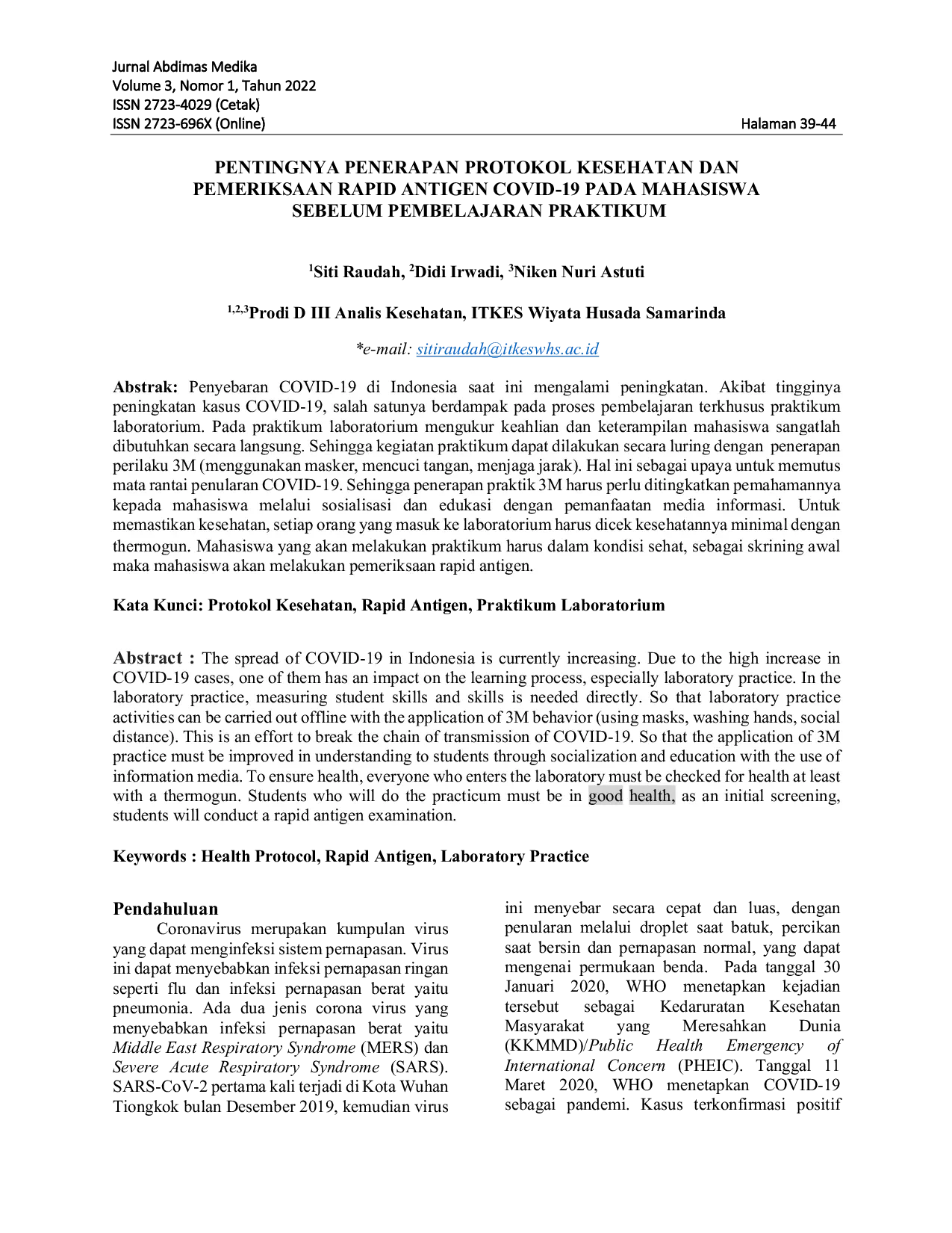 Abdimas MedikaAbdimas MedikaPenyebaran COVID-19 di Indonesia saat ini mengalami peningkatan. Akibat tingginya peningkatan kasus COVID-19, salah satunya berdampak pada proses pembelajaran terkhusus praktikum laboratorium. Pada praktikum laboratorium mengukur keahlian dan keterampilan mahasiswa sangatlah dibutuhkan secara langsung. Sehingga kegiatan praktikum dapat dilakukan secara luring dengan penerapan perilaku 3M (menggunakan masker, mencuci tangan, menjaga jarak). Hal ini sebagai upaya untuk memutus mata rantai penularan COVID-19. Sehingga penerapan praktik 3M harus perlu ditingkatkan pemahamannya kepada mahasiswa melalui sosialisasi dan edukasi dengan pemanfaatan media informasi. Untuk memastikan kesehatan, setiap orang yang masuk ke laboratorium harus dicek kesehatannya minimal dengan thermogun. Mahasiswa yang akan melakukan praktikum harus dalam kondisi sehat, sebagai skrining awal maka mahasiswa akan melakukan pemeriksaan rapid antigen.