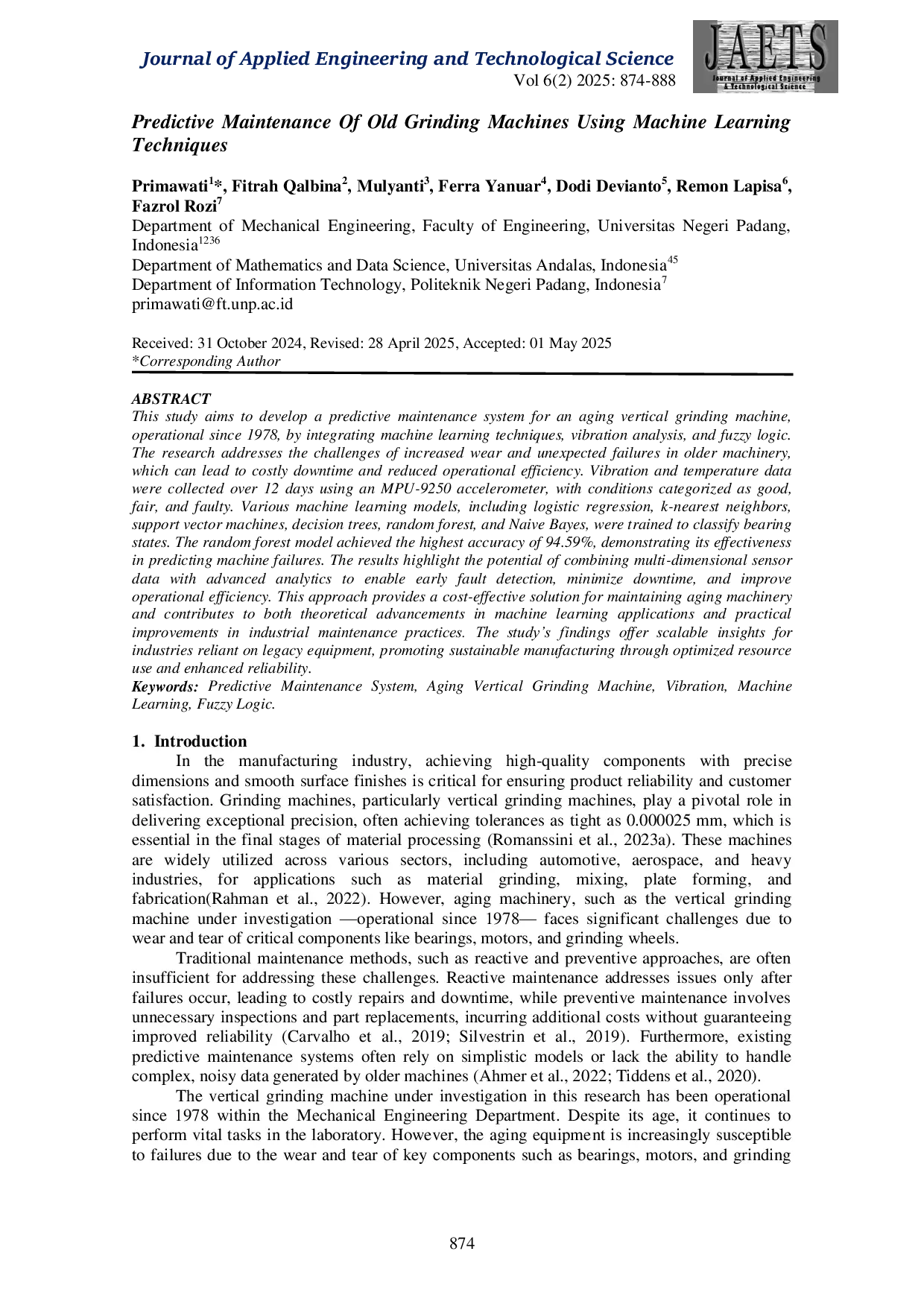 Journal of Applied Engineering and Technological Science (JAETS)Journal of Applied Engineering and Technological Science (JAETS)Penelitian ini bertujuan mengembangkan sistem pemeliharaan prediktif untuk mesin penggiling vertikal yang telah beroperasi sejak tahun 1978 dengan mengintegrasikan teknik pembelajaran mesin, analisis getaran, dan logika fuzzy. Penelitian ini menangani tantangan peningkatan keausan dan kegagalan tak terduga pada mesin lama yang dapat menyebabkan waktu henti mahal dan penurunan efisiensi operasional. Data getaran dan suhu dikumpulkan selama 12 hari menggunakan akselerometer MPU-9250, dengan kondisi dikategorikan sebagai baik, sedang, dan rusak. Berbagai model pembelajaran mesin, termasuk regresi logistik, k‑nearest neighbors, support vector machine, decision tree, random forest, dan Naive Bayes, dilatih untuk mengklasifikasikan keadaan bantalan. Model random forest mencapai akurasi tertinggi sebesar 94,59 %, menunjukkan keefektifannya dalam memprediksi kegagalan mesin. Hasil penelitian menyoroti potensi penggabungan data sensor multidimensi dengan analitik lanjutan untuk mendeteksi kerusakan secara dini, meminimalkan waktu henti, dan meningkatkan efisiensi operasional. Pendekatan ini menyediakan solusi biaya‑efektif untuk pemeliharaan mesin lama serta berkontribusi pada kemajuan teoretis dalam aplikasi pembelajaran mesin dan perbaikan praktis dalam praktik pemeliharaan industri. Temuan studi ini menawarkan wawasan yang dapat diskalakan bagi industri yang bergantung pada peralatan warisan, mendorong manufaktur berkelanjutan melalui optimalisasi penggunaan sumber daya dan peningkatan keandalan.