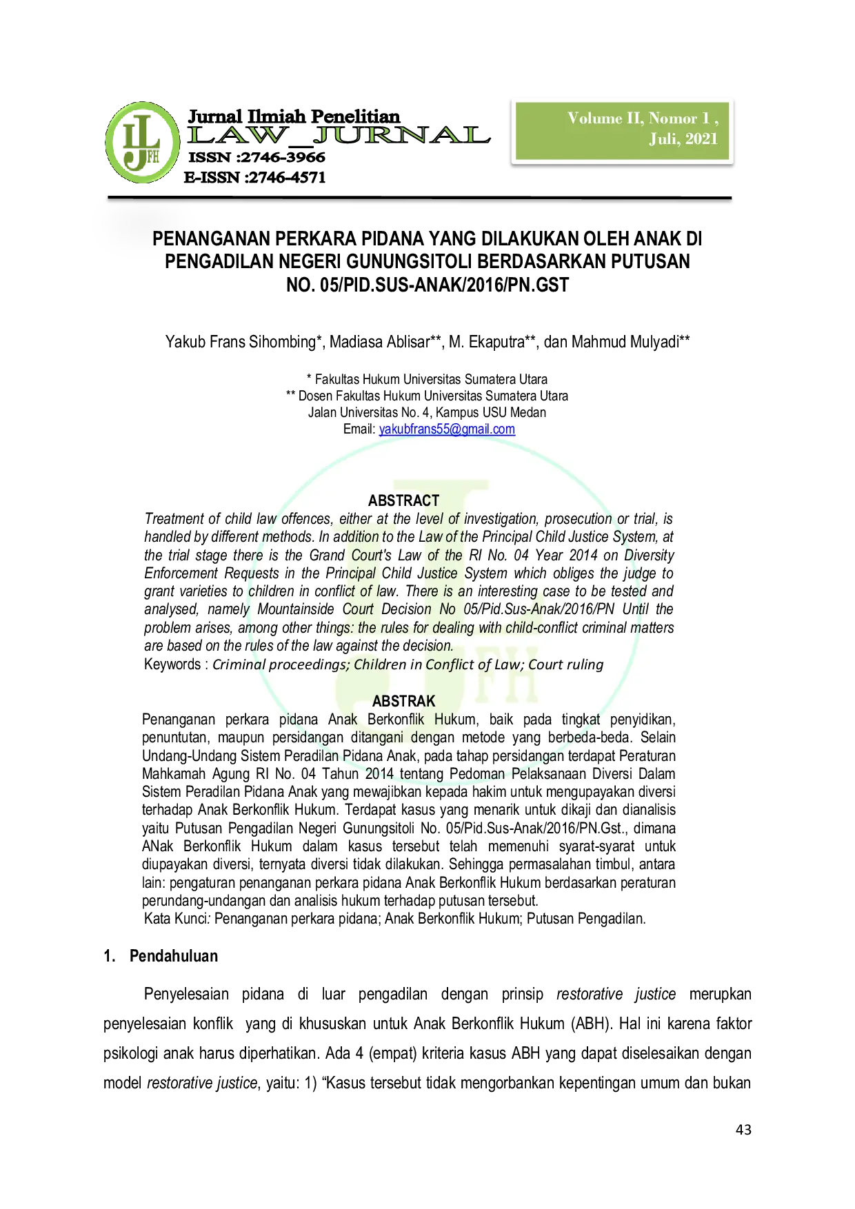 Law JurnalLaw JurnalPenanganan perkara pidana Anak Berkonflik Hukum, baik pada tingkat penyidikan, penuntutan, maupun persidangan ditangani dengan metode yang berbeda-beda. Selain Undang-Undang Sistem Peradilan Pidana Anak, pada tahap persidangan terdapat Peraturan Mahkamah Agung RI No. 04 Tahun 2014 tentang Pedoman Pelaksanaan Diversi Dalam Sistem Peradilan Pidana Anak yang mewajibkan kepada hakim untuk mengupayakan diversi terhadap Anak Berkonflik Hukum. Terdapat kasus yang menarik untuk dikaji dan dianalisis yaitu Putusan Pengadilan Negeri Gunungsitoli No. 05/Pid.Sus-Anak/2016/PN.Gst., dimana Anak Berkonflik Hukum dalam kasus tersebut telah memenuhi syarat-syarat untuk diupayakan diversi, ternyata diversi tidak dilakukan. Sehingga permasalahan timbul, antara lain: pengaturan penanganan perkara pidana Anak Berkonflik Hukum berdasarkan peraturan perundang‑undangan dan analisis hukum terhadap putusan tersebut.