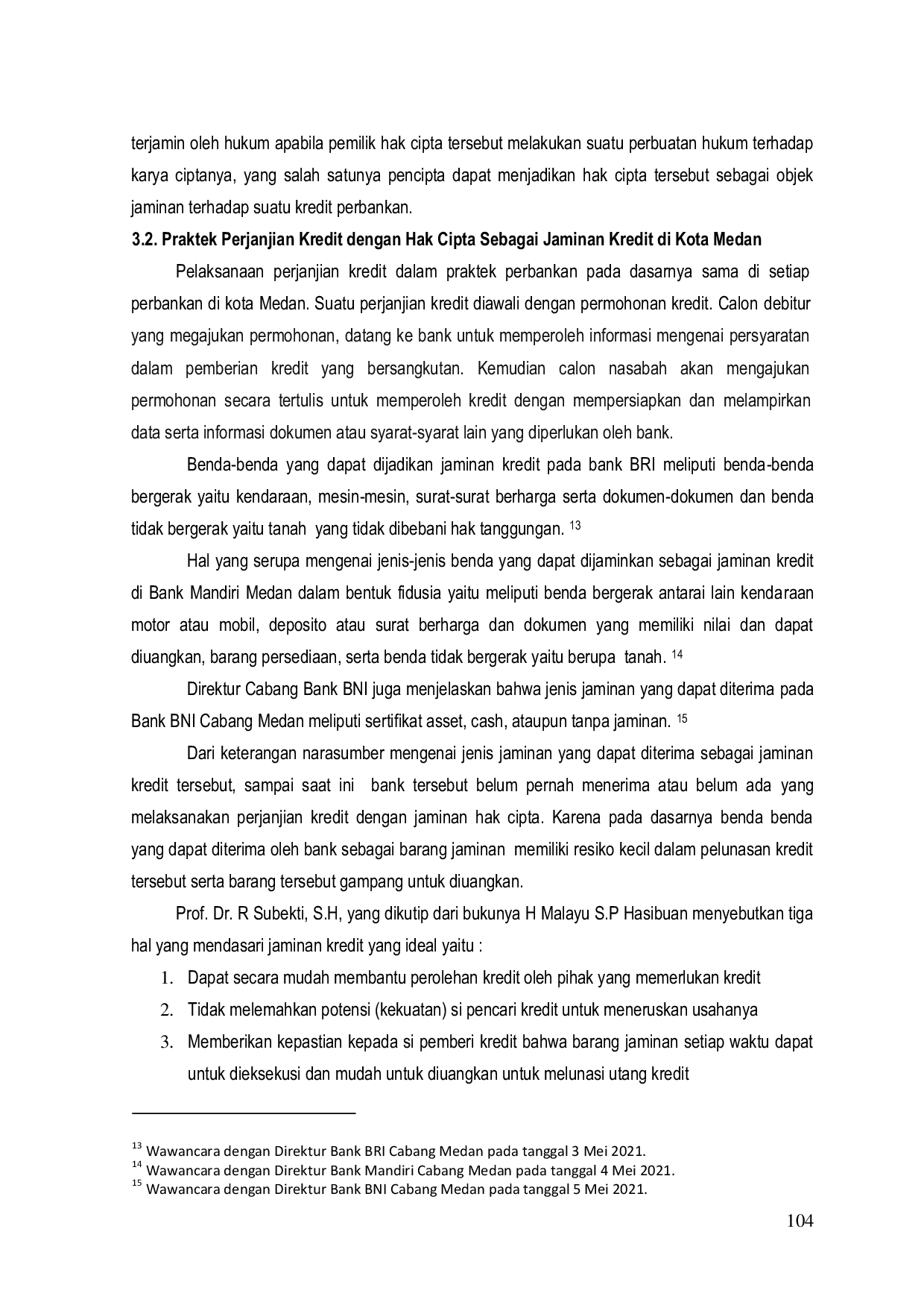 Untuk penelitian lanjutan, dapat dilakukan analisis lebih mendalam mengenai faktor-faktor yang menghambat pelaksanaan perjanjian kredit dengan jaminan hak cipta di Kota Medan. Selain itu, penelitian juga dapat fokus pada pengembangan regulasi yang mengatur secara khusus mengenai hak cipta sebagai objek jaminan, termasuk tata cara pemberian kredit dengan hak cipta dan eksekusi jaminan hak cipta apabila debitur wanprestasi. Dengan adanya regulasi yang jelas, diharapkan dapat mengurangi risiko bagi pihak perbankan dalam menerima hak cipta sebagai jaminan kredit. Selain itu, penelitian juga dapat mengeksplorasi potensi pasar dan nilai ekonomi dari hak cipta sebagai jaminan, serta menganalisis bagaimana hak cipta dapat menjadi alternatif jaminan yang efektif dan menguntungkan bagi debitur dan kreditor.