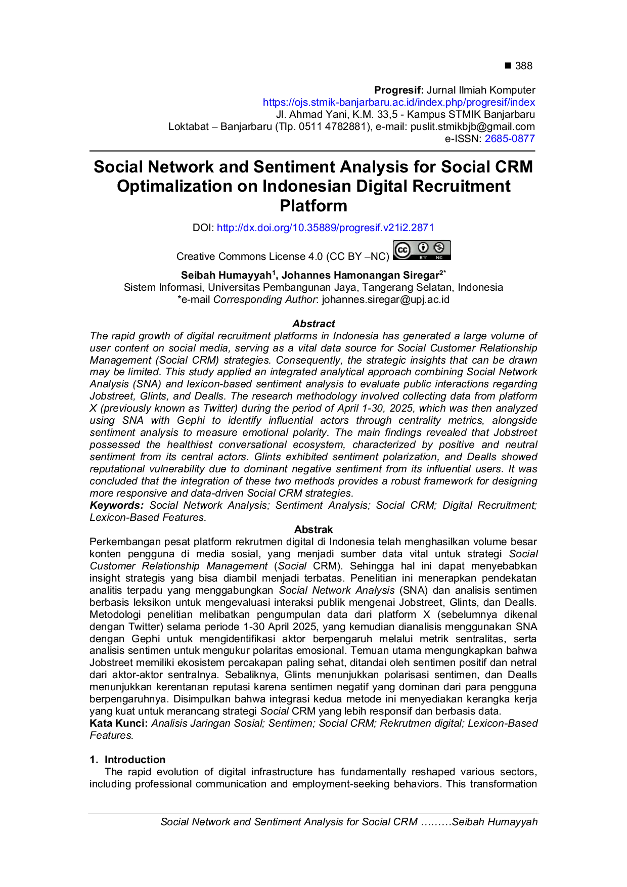 - Social Network and Sentiment Analysis for Social CRM Optimalization on Indonesian Digital Recruitment... ojs.stmik-banjarbaru.ac.id/index.php/progresif/article/view/2871Social Network and Sentiment Analysis for Social CRM Optimalization on Indonesian Digital Recruitment ojs stmik banjarbaru ac index php progresif article view 2871