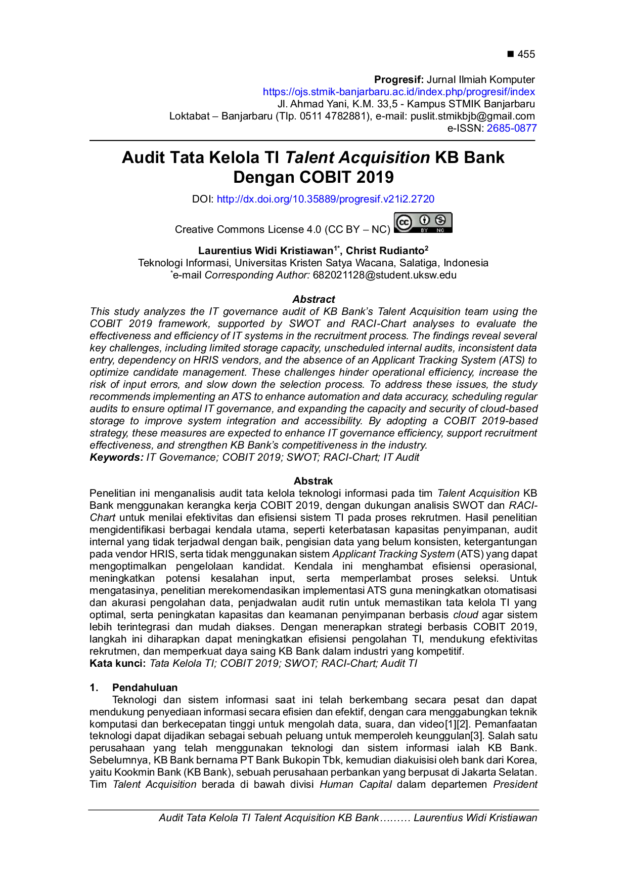 - Audit Tata Kelola TI Talent Acquisition KB Bank Dengan COBIT 2019 | Kristiawan | Progresif: Jurnal Ilmiah... doi.org/10.35889/progresif.v21i2.2720Audit Tata Kelola TI Talent Acquisition KB Bank Dengan COBIT 2019 Kristiawan Progresif Jurnal Ilmiah doi 10 35889 progresif v21i2 2720