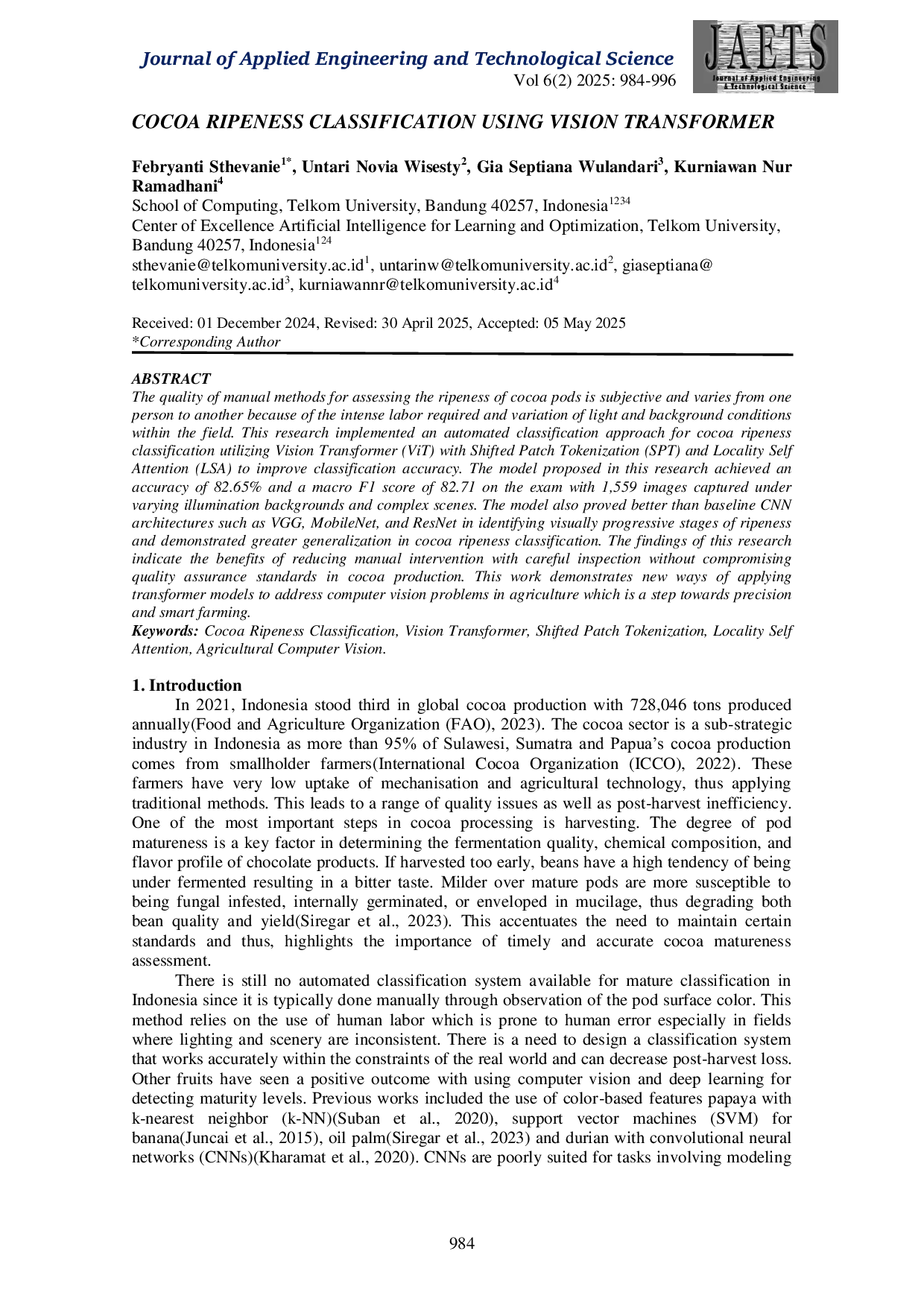 Journal of Applied Engineering and Technological Science (JAETS)Journal of Applied Engineering and Technological Science (JAETS)The quality of manual methods for assessing the ripeness of cocoa pods is subjective and varies from one person to another because of the intense labor required and variation of light and background conditions within the field. This research implemented an automated classification approach for cocoa ripeness classification utilizing Vision Transformer (ViT) with Shifted Patch Tokenization (SPT) and Locality Self Attention (LSA) to improve classification accuracy. The model proposed in this research achieved an accuracy of 82.65% and a macro F1 score of 82.71 on the exam with 1,559 images captured under varying illumination backgrounds and complex scenes. The model also proved better than baseline CNN architectures such as VGG, MobileNet, and ResNet in identifying visually progressive stages of ripeness and demonstrated greater generalization in cocoa ripeness classification. The findings of this research indicate the benefits of reducing manual intervention with careful inspection without compromising quality assurance standards in cocoa production. This work demonstrates new ways of applying transformer models to address computer vision problems in agriculture which is a step towards precision and smart farming.