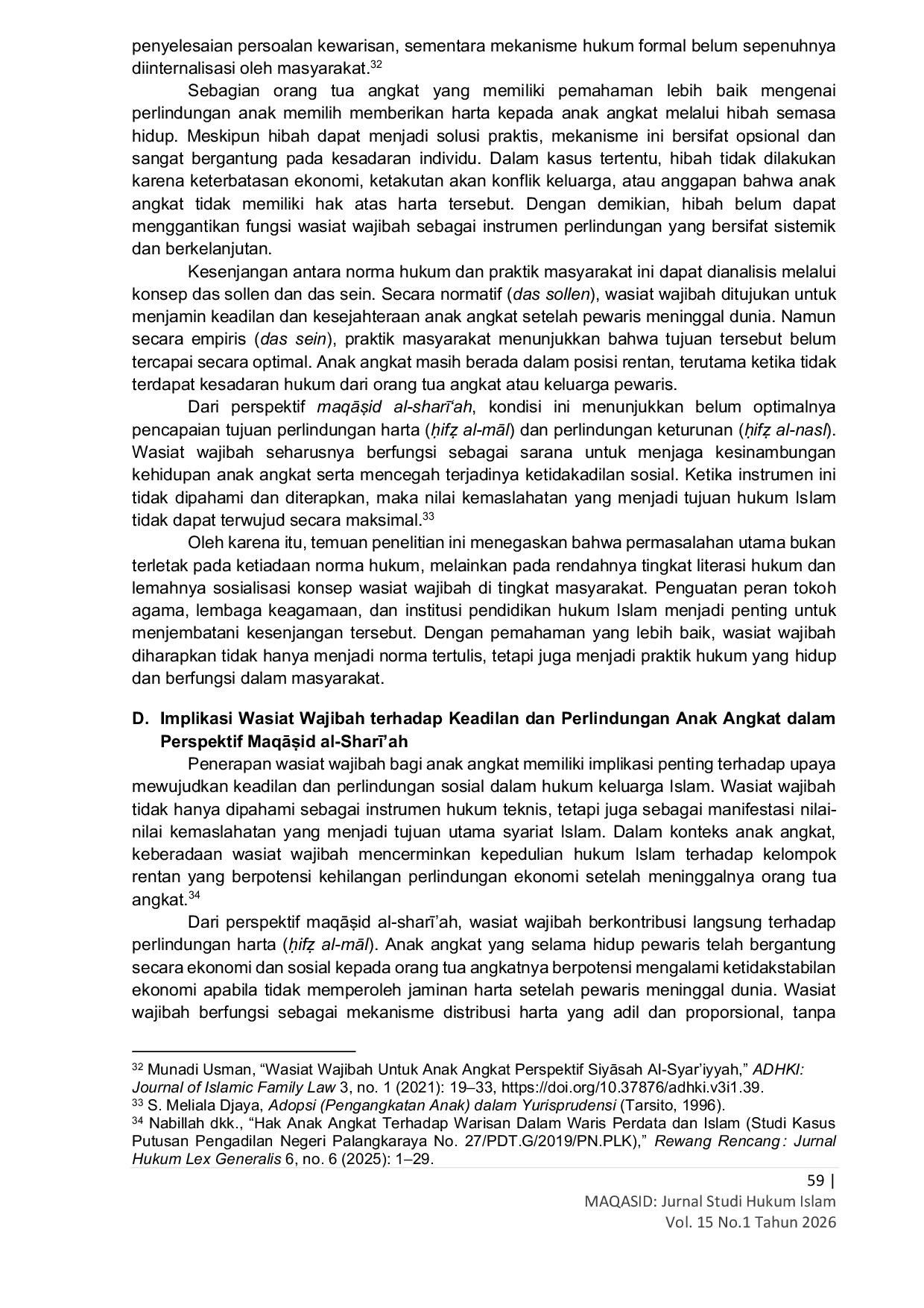 Maqasid: Jurnal Studi Hukum IslamMaqasid: Jurnal Studi Hukum IslamPraktik pengangkatan anak di banyak komunitas Muslim menimbulkan persoalan hukum terkait pola pemberian harta warisan, karena anak angkat tidak memperoleh hak waris berdasarkan nasab. Penelitian ini bertujuan menganalisis pola pemberian harta warisan bagi anak angkat di Desa Sei Rampah, mengidentifikasi faktor penghambat penerapan mekanisme hukum seperti wasiat wajibah, dan mengevaluasi implikasinya terhadap tujuan maqāṣid al‑sharīʿah. Penelitian menggunakan metode kualitatif dengan desain studi kasus; data primer diperoleh melalui observasi dan wawancara semi‑terstruktur dengan informan purposif (empat anak angkat, orang tua angkat, dan tokoh masyarakat), sementara data sekunder berasal dari kajian hukum dan literatur relevan. Kebaruan penelitian terletak pada pemadanan analisis normatif‑empiris dengan perspektif maqāṣid untuk menilai kesesuaian antara norma formal dan praktik lokal. Hasil menunjukkan bahwa pembagian harta lebih sering dilakukan melalui hibah atau musyawarah keluarga daripada mekanisme formal wasiat wajibah; hambatan utama adalah rendahnya literasi hukum dan dominasi tradisi lokal. Penelitian memberikan bukti empiris untuk rekomendasi kebijakan literasi hukum keluarga Islam dan menekankan peran tokoh agama dalam mensosialisasikan mekanisme perlindungan ekonomi bagi anak angkat.