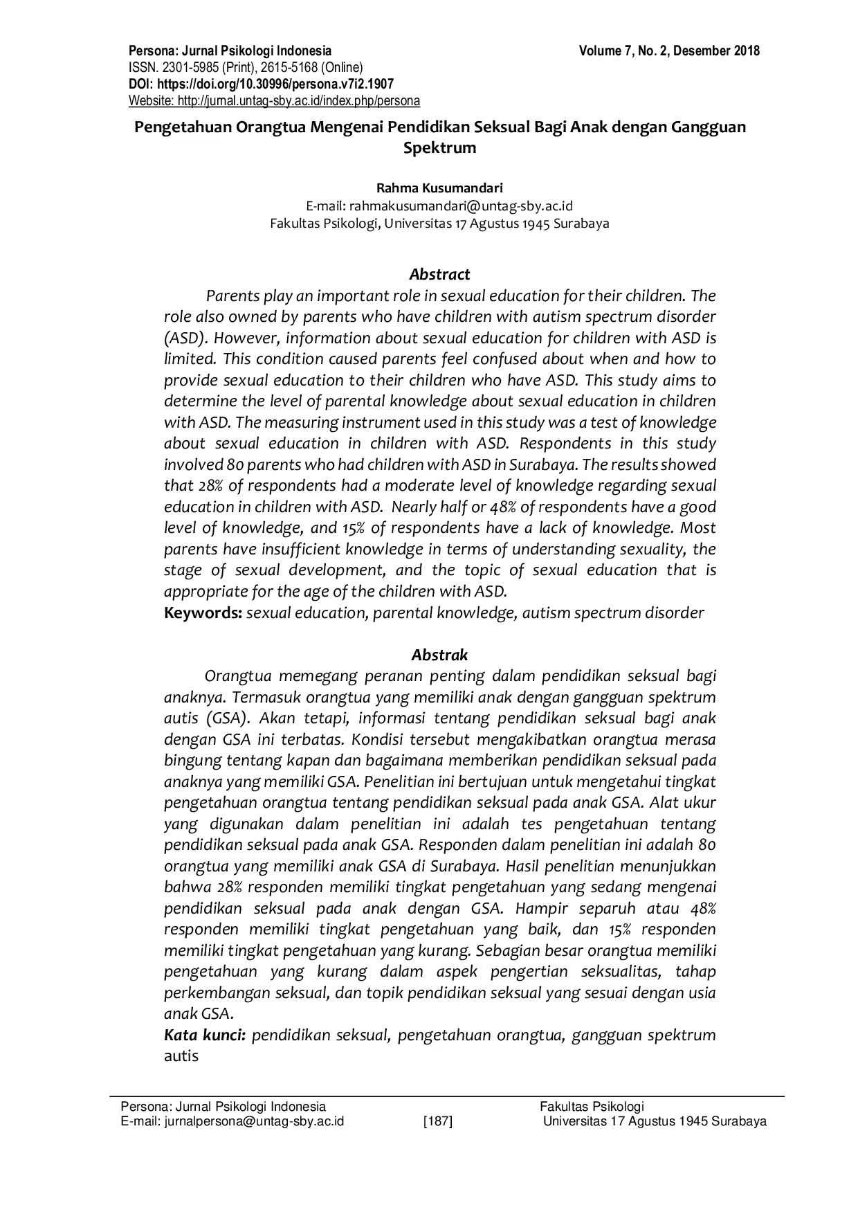Hasil penelitian menunjukkan bahwa sebagian besar orangtua yang menjadi responden memiliki tingkat pengetahuan yang cukup memadai mengenai pendidikan seksual bagi anak mereka yang memiliki GSA.Meski demikian, analisis lebih lanjut menunjukkan bahwa orangtua kurang memiliki pengetahuan pada aspek pengertian seksualitas, tahapan perkembangan seksual, dan topik pendidikan seksual yang sesuai dengan usia anak GSA.
