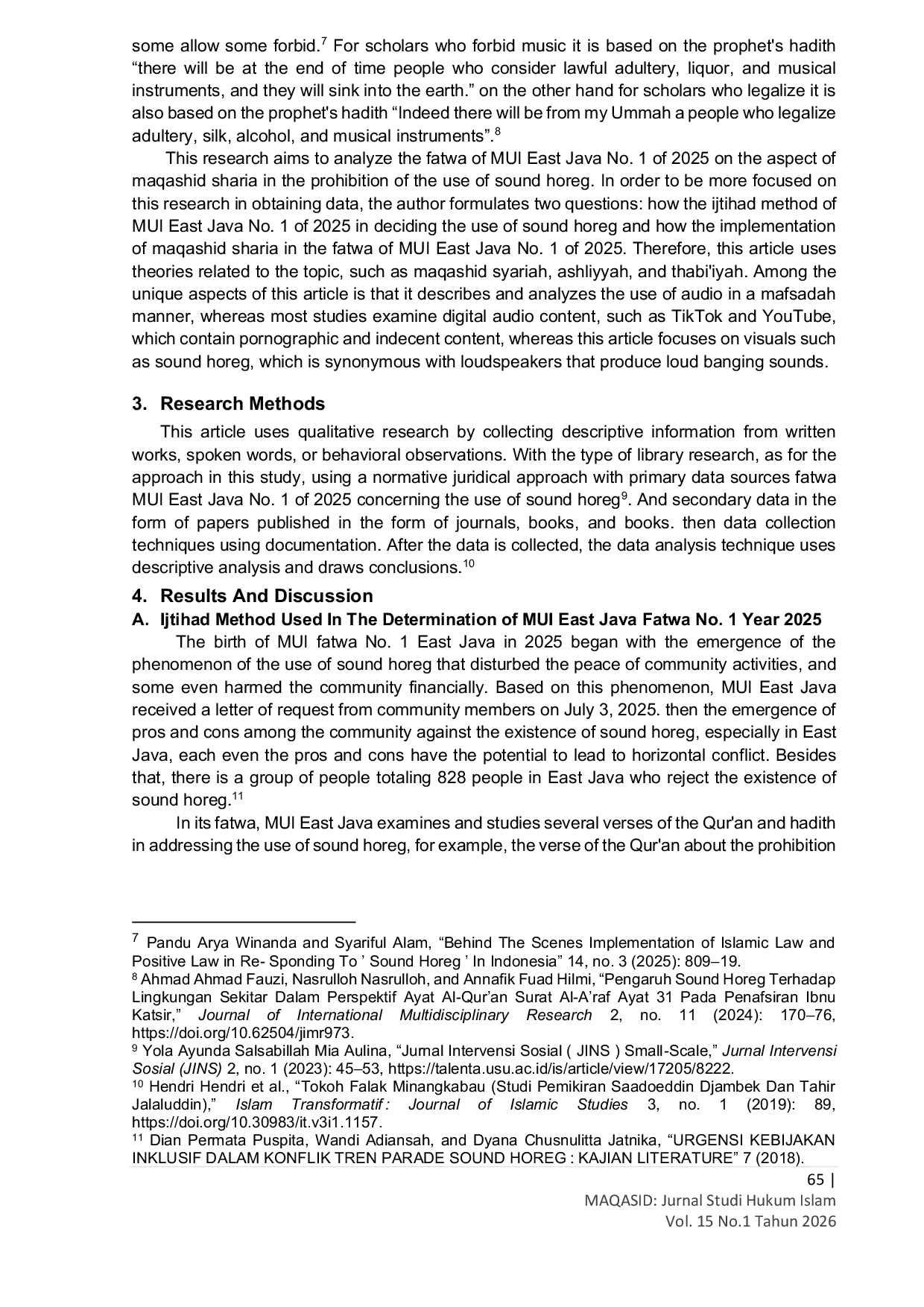 Maqasid: Jurnal Studi Hukum IslamMaqasid: Jurnal Studi Hukum IslamFenomena penggunaan sound horeg di masyarakat Jawa Timur melahirkan polemik sosial dan kesehatan, sehingga Majelis Ulama Indonesia (MUI) Jawa Timur mengharamkannya melalui Fatwa No. 1 Tahun 2025. Artikel ini bertujuan untuk mengkaji metode ijtihad yang digunakan dalam penetapan fatwa MUI Jawa Timur No. 1 Tahun 2025 dan bagaimana perspektif maqāṣid al-syarīah. Metode penelitian menggunakan pendekatan kualitatif berdasarkan studi literatur dan analisis isi fatwa, dilengkapi dengan kaidah fikih dan dalil-dalil syari. Hasil penelitian menunjukkan bahwa ijtihad MUI Jawa Timur bersifat kontekstual dengan langkah taḥqīq al-manāṭ melalui pengkajian terhadap dampak sosial dari suara yang bervolume tinggi dan istinbāṭ al-aḥkām dengan menggunakan qiyas yang dipadukan dengan kaidah fikih darul mafsadah muqaddamun ala jalbil maṣāliḥ (menolak kemudharatan lebih didahulukan daripada menarik maslahat), analisis maqashid syariah bahwa sound horeg hanya bersifat tabiiyyah (hiburan, gengsi), sedangkan mudharatnya menyentuh ashliyyah (menjaga jiwa, menjaga akal, menjaga harta, dan menjaga ketertiban). Oleh karena itu, fatwa MUI Jawa Timur No. 1 Tahun 2025 merupakan hasil ijtihad kontemporer yang integratif, memadukan teks-teks syariah klasik dengan realitas sosial modern. Hal ini menunjukkan adanya pergeseran metodologis fatwa dari yang semula bersifat normatif menjadi responsif, dengan mengedepankan prinsip maqāṣid al-syarīah sebagai instrumen utama untuk menjaga kemaslahatan umat.