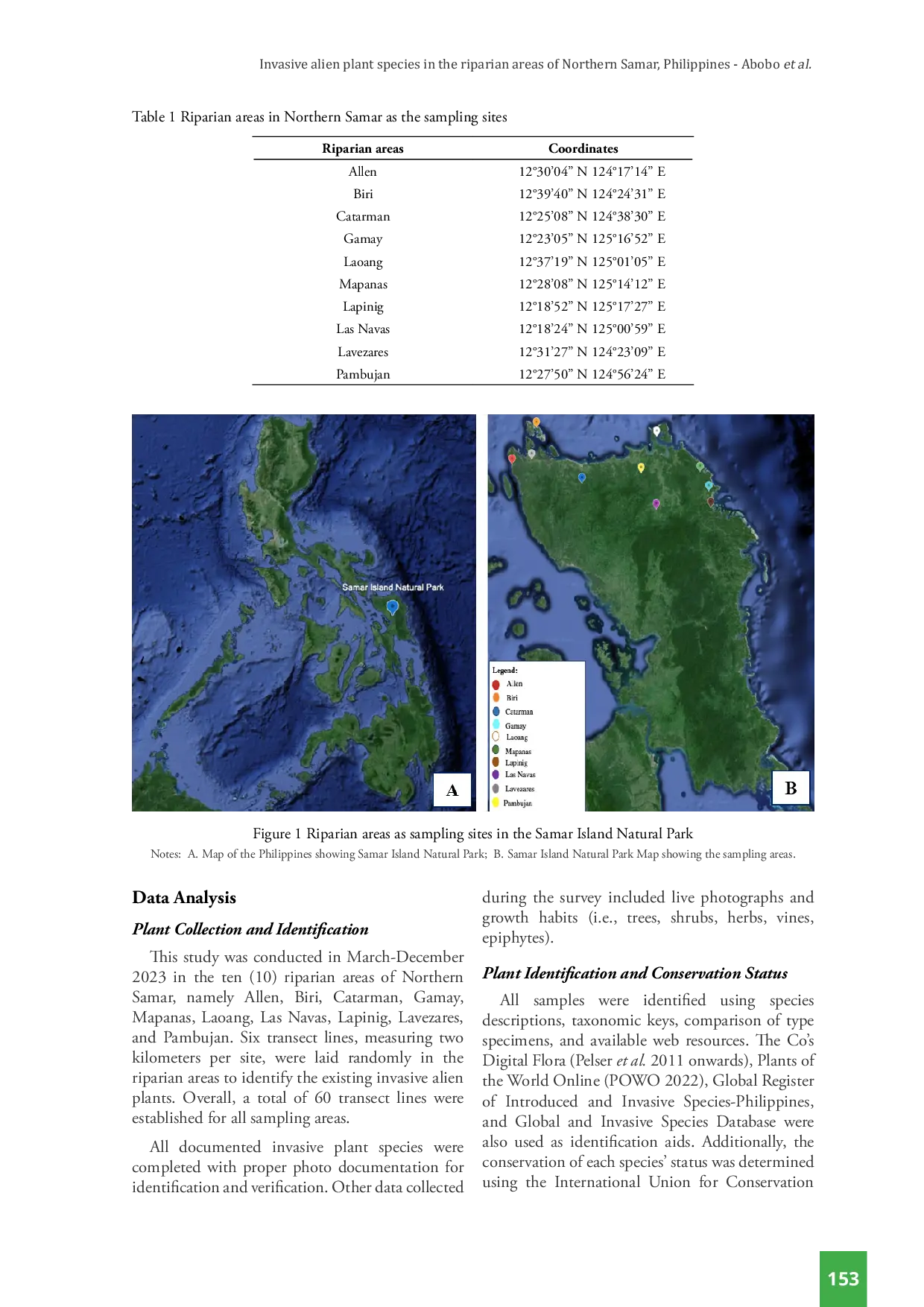 BIOTROPIABIOTROPIAWilayah riparian sangat dinamis dan alami terganggu, sehingga sangat rentan terhadap invasi. Spesies Tanaman Asing Invasif (IAPS) tersebar luas di wilayah-wilayah ini karena kondisi lingkungan yang menguntungkan yang mendukung pertumbuhan dan kelangsungan hidup mereka. Studi ini merupakan upaya perintis untuk mendokumentasikan spesies tanaman asing invasif yang tumbuh subur di zona riparian Allen, Biri, Catarman, Gamay, Mapanas, Laoang, Lapinig, Las Navas, dan Pambujan di Northern Samar. Pengambilan sampel dilakukan dari Maret hingga Desember 2023. Enam jalur transek, masing-masing berukuran dua kilometer per lokasi, didirikan di wilayah riparian untuk mengidentifikasi tanaman asing invasif yang ada. Total, 60 jalur transek didirikan di seluruh area pengambilan sampel. Sebagai hasilnya, 65 spesies tanaman yang diperkenalkan yang termasuk dalam 24 famili dan 56 genus didokumentasikan di wilayah riparian Northern Samar. Famili dengan jumlah spesies terbanyak adalah Poaceae (13 spp.), Asteraceae (12 spp.), Cyperaceae, Fabaceae, dan Lamiaceae (5 spp. masing-masing). Sisa famili memiliki kurang dari lima spesies. Spesies tanaman invasif yang paling umum tercatat adalah Psidium guajava L., yang hadir di semua area pengambilan sampel. Berdasarkan bentuk kehidupan, penelitian ini mengidentifikasi dua spesies pohon, 17 semak, tiga tanaman merambat, satu epifit, dan 42 tumbuhan herba. Status konservasi ditentukan menggunakan daftar IUCN dan DENR terbaru (2017–11). Satu takson diklasifikasikan sebagai Data Defisien, 32 sebagai Least Concern, dan spesies yang tersisa sebagai Not Evaluated. Sebaliknya, tidak ada takson yang dinilai dalam daftar DENR 2017–11. Selain itu, dari 65 spesies tanaman yang diperkenalkan yang didokumentasikan, 10 tercatat sebagai invasif di Database Spesies Asing Invasif Global, sementara 22 terdaftar di Database Global Register of Introduced and Invasive Species. Meskipun spesies tanaman asing invasif telah lama diakui sebagai ancaman serius bagi kesehatan manusia, kehutanan, pertanian, perikanan, dan keanekaragaman hayati alami, belum ada penilaian komprehensif tentang status, tren, penyebab, dampak, manajemen, dan masalah tata kelola mereka yang dilakukan di seluruh dunia. Oleh karena itu, penelitian ini bertujuan untuk melengkapi data yang ada tentang tanaman invasif dan membantu pembuat kebijakan dalam mengembangkan kerangka kebijakan untuk mengelola spesies tanaman asing invasif untuk mengurangi dampaknya terhadap kesehatan manusia dan lingkungan.