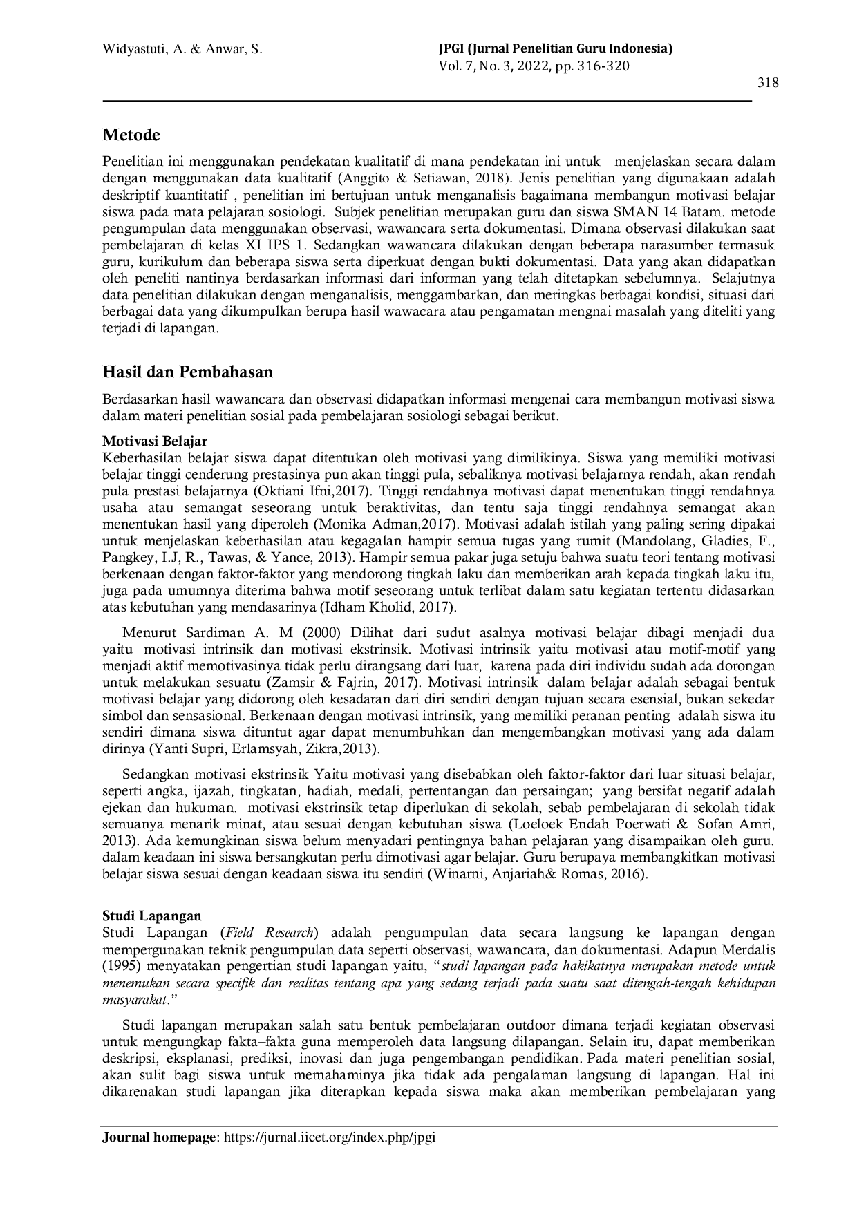 JPGI (Jurnal Penelitian Guru Indonesia)JPGI (Jurnal Penelitian Guru Indonesia)Pembelajaran merupakan suatu proses interaksi antara peserta didik dengan pendidik dan sumber belajar pada lingkungan belajar. Kegiatan ini tentunya berkelanjutan dan cukup membosankan untuk siswa. Rutinitas yang selalu dilakukan di dalam kelas dan membuat siswa jenuh dengan suasana yang ada. Hal ini yang justru memadamkan perlahan demi perlahan motivasi siswa dalam belajar. Apalagi dengan pembelajaran sosiologi yang mana dalam pemikiran siswa adalah pelajaran yang kurang menyenangkan karena terlalu banyak hafalan. Tujuan penelitian ini adalah menganalisis serta mengidentifikasi cara . Metode penelitian menggunakaan deskriptif kualitatif dengan subjek penelitian guru dan siswa SMAN 14 Batam. Teknik pengumpulan datanya menggunakan observasi, wawancara dan dokumentasi. Dari hasil penelitian menunjukkan bahwa motivasi siswa dapat terbangun dalam pembelajaran sosiologi khususnya materi penelitian sosial melalui studi lapangan dan kolaborasi guru. Kedua cara ini dapat membangun suasana baru yang dapat memunculkan motivasi siswa dalam belajar khususnya dalam materi penelitian sosial.