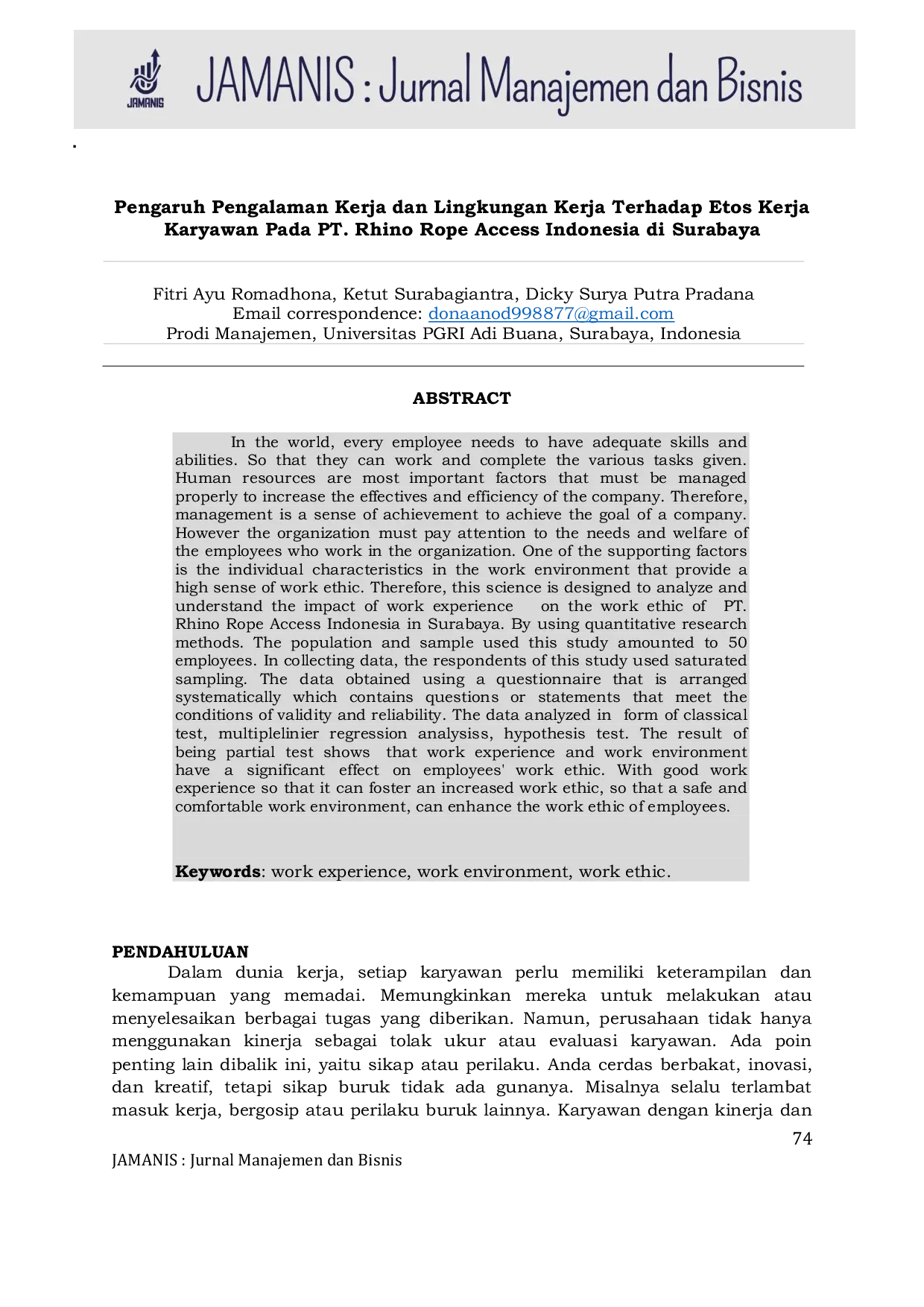 Jurnal Manajemen dan BisnisJurnal Manajemen dan BisnisDi dunia ini, setiap karyawan perlu memiliki keterampilan dan kemampuan yang memadai agar dapat bekerja dan menyelesaikan berbagai tugas yang diberikan. Sumber daya manusia merupakan faktor terpenting yang harus dikelola dengan baik untuk meningkatkan efektivitas dan efisiensi perusahaan. Oleh karena itu, manajemen sumber daya manusia merupakan perencanaan kegiatan untuk memperoleh, mengembangkan, menjaga, dan memanfaatkan tenaga kerja untuk memajukan perusahaan. Organisasi juga harus memperhatikan kebutuhan dan kesejahteraan karyawan. Salah satu faktor pendukung adalah karakteristik pribadi dan pengalaman kerja yang dapat meningkatkan etos kerja. Penelitian ini bertujuan untuk menganalisis dampak pengalaman kerja terhadap etos kerja karyawan PT. Rhino Rope Access Indonesia di Surabaya menggunakan metode penelitian kuantitatif. Populasi dan sampel penelitian terdiri dari 50 karyawan, dengan pengumpulan data menggunakan kuesioner yang valid dan reliabel. Analisis data meliputi uji klasik, analisis regresi linier berganda, dan uji hipotesis. Hasil penelitian menunjukkan bahwa pengalaman kerja dan lingkungan kerja memiliki pengaruh signifikan terhadap etos kerja karyawan. Pengalaman kerja yang baik dapat meningkatkan etos kerja, dan lingkungan kerja yang aman dan nyaman dapat meningkatkan motivasi karyawan.