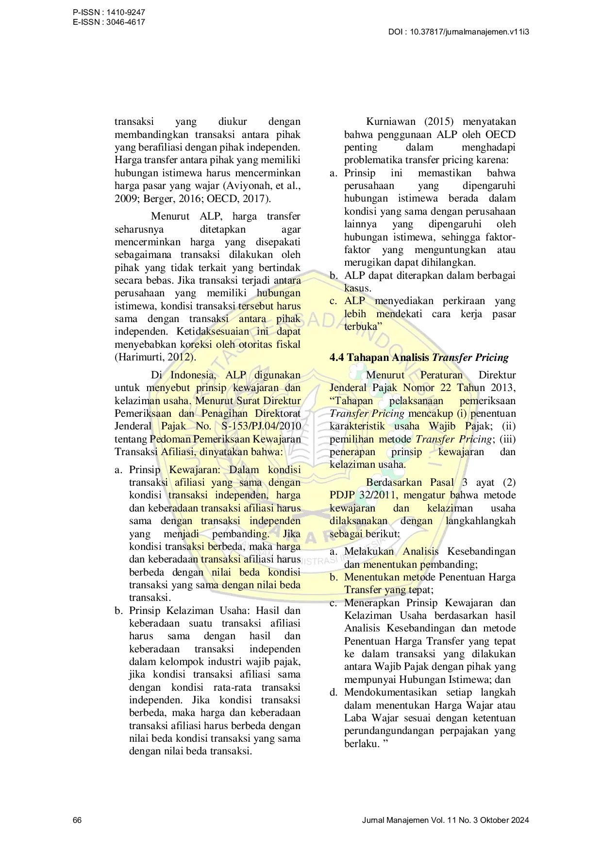 Jurnal ManajemenJurnal ManajemenTransfer pricing sering kali dianggap sebagai praktik negatif yang digunakan oleh perusahaan multinasional untuk mengalihkan laba dari negara dengan tarif pajak tinggi ke negara dengan tarif pajak rendah, sehingga mengurangi beban pajak. Penelitian ini membahas regulasi hubungan istimewa dan prinsip kewajaran dalam penerapan dokumentasi transfer pricing di Indonesia dari perspektif perpajakan. OECD memberikan pedoman bagi perusahaan multinasional dan otoritas pajak untuk menangani isu transfer pricing. Indonesia mengadopsi pedoman ini melalui berbagai peraturan, termasuk PER-43/PJ/2010 dan PMK 213/PMK.03/2016, yang mengatur kewajiban dokumentasi bagi wajib pajak yang melakukan transaksi afiliasi. Penelitian ini menggunakan metode deskriptif normatif dengan data dari regulasi pemerintah, jurnal, buku, dan wawancara dengan informan terkait. Pembahasan mencakup konsep transfer pricing, perspektif akuntansi manajerial dan perpajakan, serta regulasi dan tahapan analisis transfer pricing di Indonesia. Hasil penelitian menunjukkan bahwa penerapan prinsip kewajaran dan kelaziman usaha bertujuan untuk memastikan bahwa transaksi antar pihak afiliasi dilakukan seolah-olah mereka adalah pihak independen, sehingga mencegah manipulasi transfer pricing dan penghindaran pajak.
