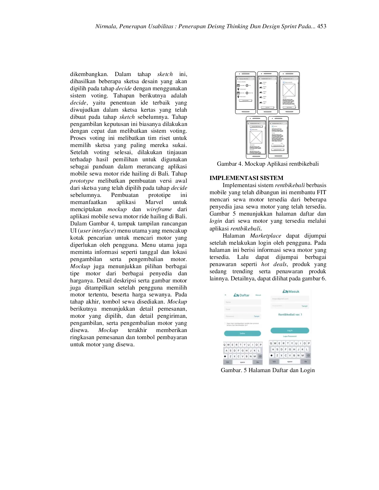 Jurnal Teknologi Informasi dan KomputerJurnal Teknologi Informasi dan KomputerPada tahun 2019, Kementerian Pariwisata Indonesia meluncurkan inisiatif Go Digital sebagai strategi untuk mengatasi pertumbuhan jumlah wisatawan milenial dalam negeri. Wisatawan generasi muda ini memiliki pola konsumsi wisata yang berbeda, dengan pembelian tiket, pemesanan akomodasi, dan pemilihan paket wisata yang semuanya dilakukan secara digital. Mereka dikenal sebagai individu yang mandiri dan cenderung mengandalkan teknologi digital dalam kegiatan traveling mereka. Golongan wisatawan ini sering disebut sebagai free independent traveler (FIT) yang umumnya terdiri dari kaum muda sekitar 21 – 36 tahun. Terkait dengan pariwisata di Bali dan potensi dari pasar wisatawan FIT ini, semakin banyak FIT yang mengunjungi Bali. Mereka mendapatkan rekomendasi destinasi dari media sosial. Kebutuhan informasi pariwisata melalui media sosial banyak tersebar melalui akun-akun traveling di Bali melalui social media Instagram dan tiktok. Namun, terdapat kendala-kendala dalam situasi ini. Beberapa masalah yang dihadapi oleh FIT meliputi kesulitan dalam menemukan kendaraan yang sesuai dengan anggaran mereka. Biasanya, mereka hanya mencari penyewaan di sekitar tempat menginap, dan berusaha mencari layanan sewa motor terdekat untuk digunakan dalam menjelajahi tempat-tempat wisata di Bali. Namun, seringkali FIT mengalami kesulitan menemukan motor yang sesuai dengan standar mereka. Oleh karena itu, mereka kesulitan menemukan tempat sewa motor yang dapat diandalkan dan sesuai dengan kebutuhan mereka. Dalam konteks ini, aplikasi berbasis mobile yang dikembangkan dalam penelitian ini diharapkan menjadi prototipe yang dapat membantu mengatasi masalah yang dihadapi oleh FIT. Pada tahap perancangan, aplikasi ini menggunakan metodologi design thinking dan kerangka kerja design sprint. Dalam tahap pengembangan, model arsitektur Model-View-ViewModel (MVVM) digunakan. Pada tahap akhir, dilakukan analisis atau kajian usabilitas terhadap aplikasi mobile rentbikebali untuk mengevaluasi pengalaman pengguna, efektivitas dan usabilitas aplikasi rentbikebali yang dikembangkan dalam penelitian ini. Dari kajian usabilitas didapatkan bahwa sebanyak 77,3 % atau skala 3,87 aplikasi ini sudah memenuhi aspek usabilitas: Learnability, Satisfaction, memorability, error frequency, efficiency of use.