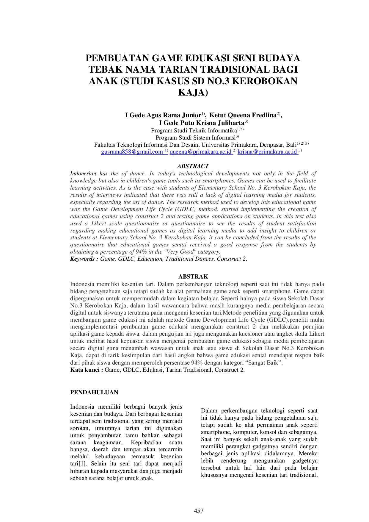 Jurnal Teknologi Informasi dan KomputerJurnal Teknologi Informasi dan KomputerIndonesia memiliki kesenian tari. Dalam perkembangan teknologi seperti saat ini tidak hanya pada bidang pengetahuan saja tetapi sudah ke alat permainan game anak seperti smartphone. Game dapat dipergunakan untuk mempermudah dalam kegiatan belajar. Seperti halnya pada siswa Sekolah Dasar No.3 Kerobokan Kaja, dalam hasil wawancara bahwa masih kurangnya media pembelajaran secara digital untuk siswanya terutama pada mengenai kesenian tari.Metode penelitian yang digunakan untuk membangun game edukasi ini adalah metode Game Development Life Cycle (GDLC).peneliti mulai mengimplementasi pembuatan game edukasi mengunakan construct 2 dan melakukan penujian aplikasi game kepada siswa. dalam pengujian ini juga mengunakan kuesioner atau angket skala Likert untuk melihat hasil kepuasan siswa mengenai pembuatan game edukasi sebagai media pembelajaran secara digital guna menambah wawasan untuk anak atau siswa di Sekolah Dasar No.3 Kerobokan Kaja, dapat di tarik kesimpulan dari hasil angket bahwa game edukasi sentai mendapat respon baik dari pihak siswa dengan memperoleh persentase 94% dengan kategori “Sangat Baik.