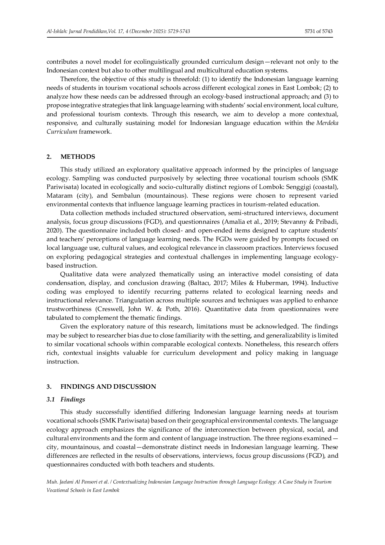 Al-Ishlah: Jurnal PendidikanAl-Ishlah: Jurnal PendidikanThis study explores the contextual needs of Indonesian language instruction in tourism vocational high schools (SMK Pariwisata) in East Lombok by aligning the Merdeka Curriculum with the principles of language ecology. Generic instructional models often fail to address the ecological, cultural, and occupational realities faced by students in vocational settings. An exploratory qualitative approach was employed using a language ecology framework. Data were collected through observations, interviews, document analysis, focus group discussions (FGDs), and questionnaires across three ecological zones: urban (Mataram City), coastal (Senggigi), and mountainous (Sembalun). Thematic analysis and data triangulation were conducted to identify region-specific linguistic demands. Findings revealed significant variation in learning needs across ecological zones. In coastal areas, 88% of students required practical spoken language for tourism communication. In urban areas, 82% prioritized formal and professional Indonesian for business and bureaucratic contexts. Meanwhile, 91% of students in mountainous regions expressed a preference for materials rooted in local folklore and cultural heritage. Teacher responses (above 85% in all regions) affirmed the importance of integrating local context into instructional content. Effective strategies identified included simulation-based learning, project-based activities, and the development of culturally relevant texts. These results suggest that Indonesian language instruction in SMK Pariwisata should be differentiated based on ecological contexts and grounded in local cultural and professional practices. The study recommends teacher training in ecolinguistics, curriculum adaptation, and cross-sector collaboration with tourism stakeholders to ensure linguistically relevant and workforce-aligned education.