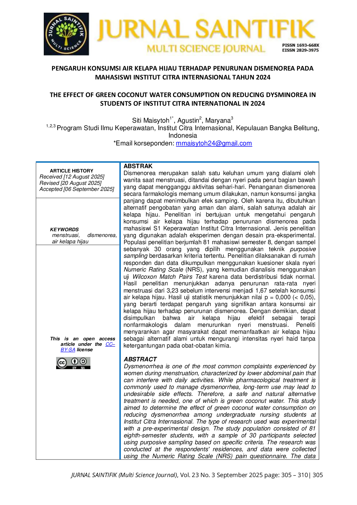 Jurnal Saintifik (Multi Science Journal)Jurnal Saintifik (Multi Science Journal)Dismenorea merupakan salah satu keluhan umum yang dialami oleh wanita saat menstruasi, ditandai dengan nyeri pada perut bagian bawah yang dapat mengganggu aktivitas sehari-hari. Penanganan dismenorea secara farmakologis memang umum dilakukan, namun konsumsi jangka panjang dapat menimbulkan efek samping. Oleh karena itu, dibutuhkan alternatif pengobatan yang aman dan alami, salah satunya adalah air kelapa hijau. Penelitian ini bertujuan untuk mengetahui pengaruh konsumsi air kelapa hijau terhadap penurunan dismenorea pada mahasiswi S1 Keperawatan Institut Citra Internasional. Jenis penelitian yang digunakan adalah eksperimen dengan desain pra-eksperimental. Populasi penelitian berjumlah 81 mahasiswi semester 8, dengan sampel sebanyak 30 orang yang dipilih menggunakan teknik purposive sampling berdasarkan kriteria tertentu. Penelitian dilaksanakan di rumah responden dan data dikumpulkan menggunakan kuesioner skala nyeri Numeric Rating Scale (NRS), yang kemudian dianalisis menggunakan uji Wilcoxon Match Pairs Test karena data berdistribusi tidak normal. Hasil penelitian menunjukkan adanya penurunan rata-rata nyeri menstruasi dari 3,23 sebelum intervensi menjadi 1,67 setelah konsumsi air kelapa hijau. Hasil uji statistik menunjukkan nilai p = 0,000 (< 0,05), yang berarti terdapat pengaruh yang signifikan antara konsumsi air kelapa hijau terhadap penurunan dismenorea. Dengan demikian, dapat disimpulkan bahwa air kelapa hijau efektif sebagai terapi nonfarmakologis dalam menurunkan nyeri menstruasi. Peneliti menyarankan agar masyarakat dapat memanfaatkan air kelapa hijau sebagai alternatif alami untuk mengurangi intensitas nyeri haid tanpa ketergantungan pada obat-obatan kimia.