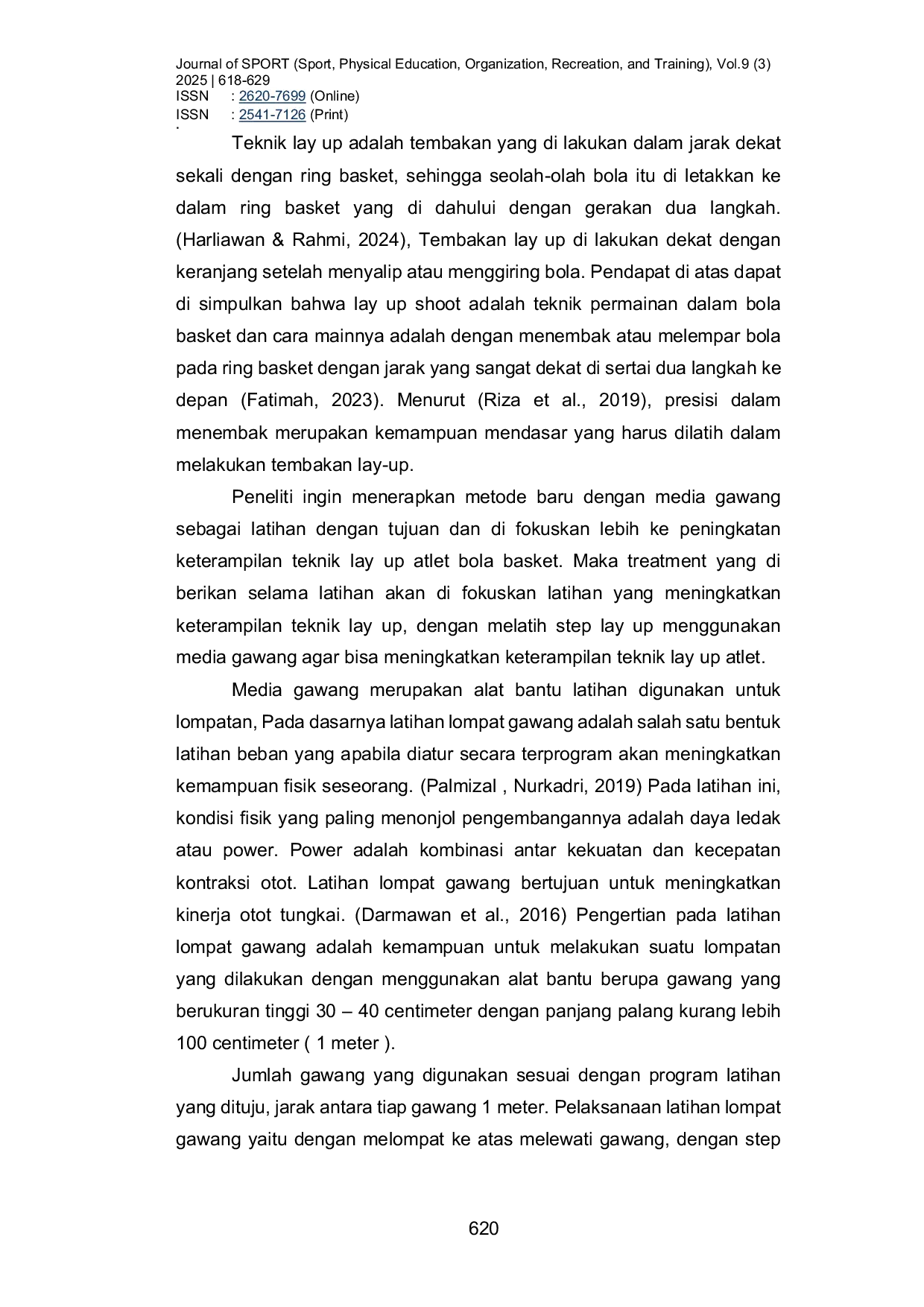 Journal of SPORT (Sport, Physical Education, Organization, Recreation, and Training)Journal of SPORT (Sport, Physical Education, Organization, Recreation, and Training)Penelitian ini bertujuan untuk mengkaji . Penelitian ini menggunakan metode eksperimen dengan desain one group pretest-posttest. Populasi penelitian adalah atlet bola basket Club South Basketball Tasikmalaya. Teknik pengambilan sampel menggunakan total sampling dengan jumlah sampel penelitian 10 orang. Instrumen yang digunakan adalah tes lay up. Subjek diberikan perlakuan berupa program latihan step lay up dengan media alat seperti gawang selama 8 kali pertemuan. Teknik analisis data yang digunakan adalah uji-t. Hasil penelitian menunjukkan perbedaan rata-rata dari persentase pre-test dan post-test pada program latihan step lay up dengan media gawang terhadap keterampilan lay up atlet bola basket sebesar 36%. Hasil penelitian menunjukkan bahwa terdapat pengaruh yang signifikan dari latihan step lay up dengan media gawang terhadap keterampilan lay up atlet bola basket.