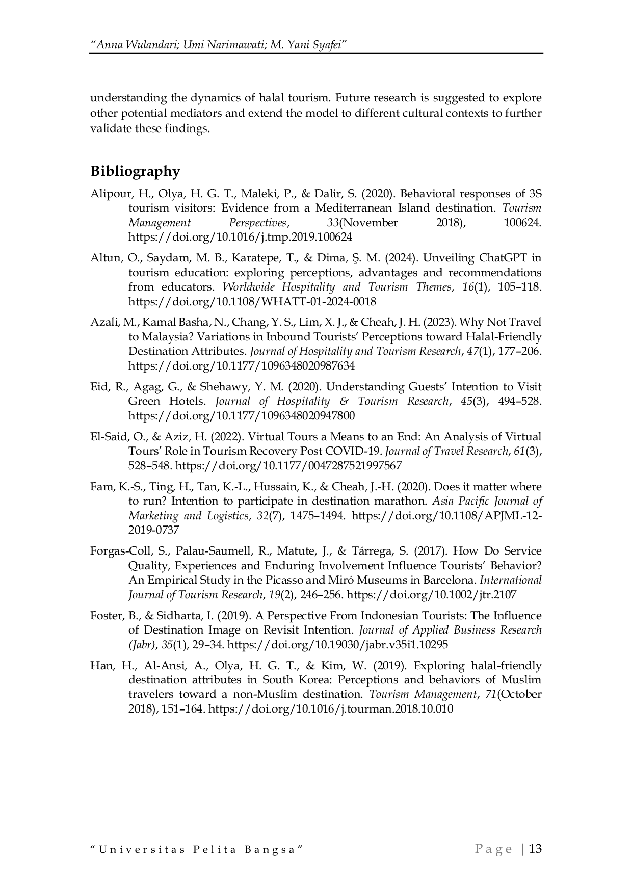 Studi ini menyimpulkan bahwa atribut ramah halal secara signifikan memengaruhi niat berkunjung di destinasi wisata, dengan citra destinasi dan adopsi kecerdasan buatan (AI) bertindak sebagai mediator krusial.Temuan menunjukkan bahwa atribut ramah halal meningkatkan citra destinasi, yang selanjutnya secara positif memengaruhi adopsi AI dan niat berkunjung wisatawan.Penelitian ini memberikan bukti empiris mengenai integrasi faktor budaya dan teknologi, serta menyoroti peran mediasi ganda citra destinasi dan adopsi AI dalam menarik wisatawan Muslim.