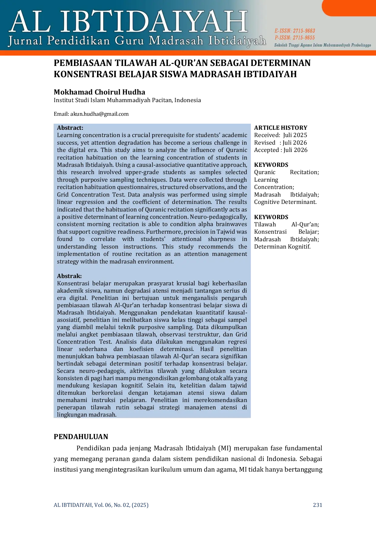AL IBTIDAIYAH: Jurnal Pendidikan Guru Madrasah IbtidaiyahAL IBTIDAIYAH: Jurnal Pendidikan Guru Madrasah IbtidaiyahKonsentrasi belajar merupakan prasyarat krusial bagi keberhasilan akademik siswa, namun degradasi atensi menjadi tantangan serius di era digital. Penelitian ini bertujuan untuk menganalisis pengaruh pembiasaan tilawah Al-Quran terhadap konsentrasi belajar siswa di Madrasah Ibtidaiyah. Menggunakan pendekatan kuantitatif kausal-asosiatif, penelitian ini melibatkan siswa kelas tinggi sebagai sampel yang diambil melalui teknik purposive sampling. Data dikumpulkan melalui angket pembiasaan tilawah, observasi terstruktur, dan Grid Concentration Test. Analisis data dilakukan menggunakan regresi linear sederhana dan koefisien determinasi. Hasil penelitian menunjukkan bahwa pembiasaan tilawah Al-Quran secara signifikan bertindak sebagai determinan positif terhadap konsentrasi belajar. Secara neuro-pedagogis, aktivitas tilawah yang dilakukan secara konsisten di pagi hari mampu mengondisikan gelombang otak alfa yang mendukung kesiapan kognitif. Selain itu, ketelitian dalam tajwid ditemukan berkorelasi dengan ketajaman atensi siswa dalam memahami instruksi pelajaran. Penelitian ini merekomendasikan penerapan tilawah rutin sebagai strategi manajemen atensi di lingkungan madrasah.