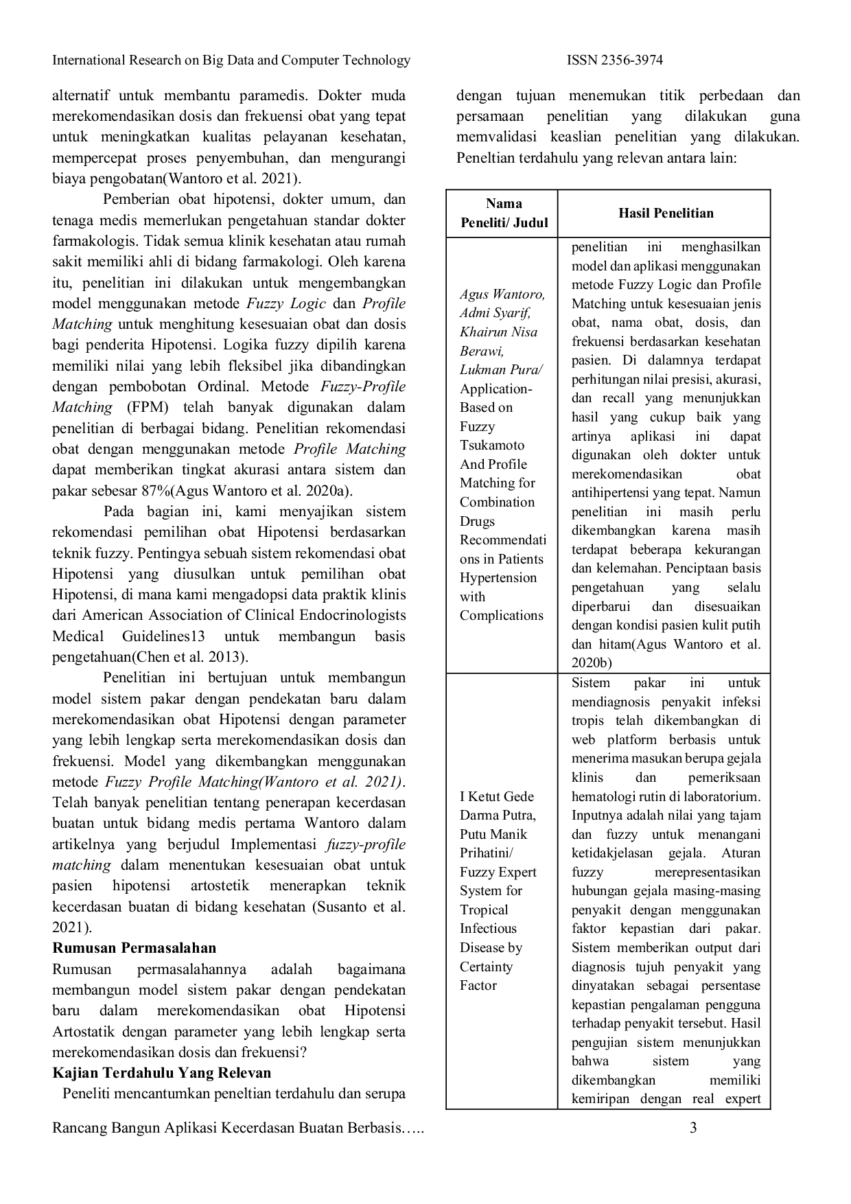 International Research on Big-Data and Computer Technology: I-RobotInternational Research on Big-Data and Computer Technology: I-RobotAplikasi Kecerdasan Buatan Berbasis Fuzzy Profile Matching Sebagai Rekomendasi Obat Pasien Hipotensi Ortostatik dikembangkan menggunakan bahasa pemrograman Pascal dan Borland Delphi sebagai GUI. Aplikasi ini memiliki tiga bagian utama: Form Menu Utama, Form perhitungan rekomendasi obat, dosis, dan frekuensi, serta Form Informasi Singkat Tentang Aplikasi. Tujuan pengembangan aplikasi ini adalah untuk membantu dokter muda dalam memberikan rekomendasi obat dengan metode Fuzzy Profile Matching. Hasil penelitian menunjukkan bahwa sistem dapat merekomendasikan jenis obat, dosis, dan frekuensi penggunaan yang tepat, mengurangi kesalahan petugas medis, serta memberikan dampak positif bagi pasien dalam hal waktu, proses penyembuhan, dan biaya. Penelitian ini menemukan bahwa penentuan obat hipotensi memerlukan 17 parameter pasien, dengan dua jenis obat yang cocok yaitu Fludrocortisone dan Midodrine.
