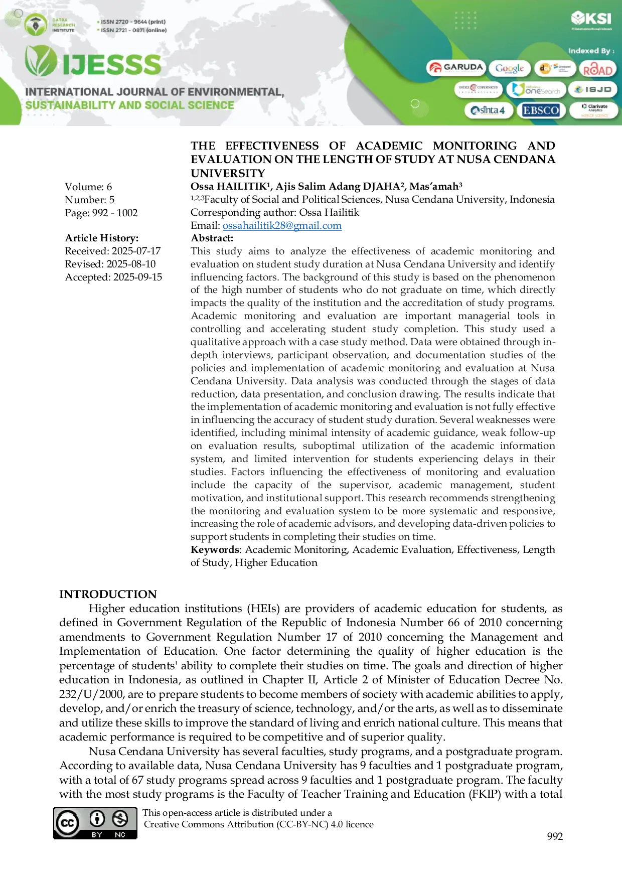 International Journal of Environmental, Sustainability, and Social ScienceInternational Journal of Environmental, Sustainability, and Social SciencePenelitian ini bertujuan menganalisis efektivitas pemantauan dan evaluasi akademik terhadap lama studi mahasiswa di Universitas Nusa Cendana serta mengidentifikasi faktor‑faktor yang mempengaruhinya. Latar belakang penelitian didasarkan pada fenomena tingginya jumlah mahasiswa yang tidak lulus tepat waktu, yang berdampak pada kualitas institusi dan akreditasi program studi. Penelitian menggunakan pendekatan kualitatif dengan metode studi kasus, mengumpulkan data melalui wawancara mendalam, observasi partisipan, dan studi dokumentasi kebijakan serta pelaksanaan pemantauan dan evaluasi akademik. Hasil menunjukkan bahwa pelaksanaan pemantauan dan evaluasi belum sepenuhnya efektif dalam mempengaruhi akurasi lama studi, dengan kelemahan pada intensitas bimbingan akademik, tindak lanjut hasil evaluasi, pemanfaatan sistem informasi akademik, dan intervensi bagi mahasiswa yang mengalami keterlambatan. Faktor‑faktor yang memengaruhi efektivitas meliputi kapasitas pembimbing, manajemen akademik, motivasi mahasiswa, dan dukungan institusi. Penelitian merekomendasikan penguatan sistem pemantauan dan evaluasi agar lebih sistematik, responsif, serta peningkatan peran penasihat akademik dan kebijakan berbasis data untuk mendukung penyelesaian studi tepat waktu.
