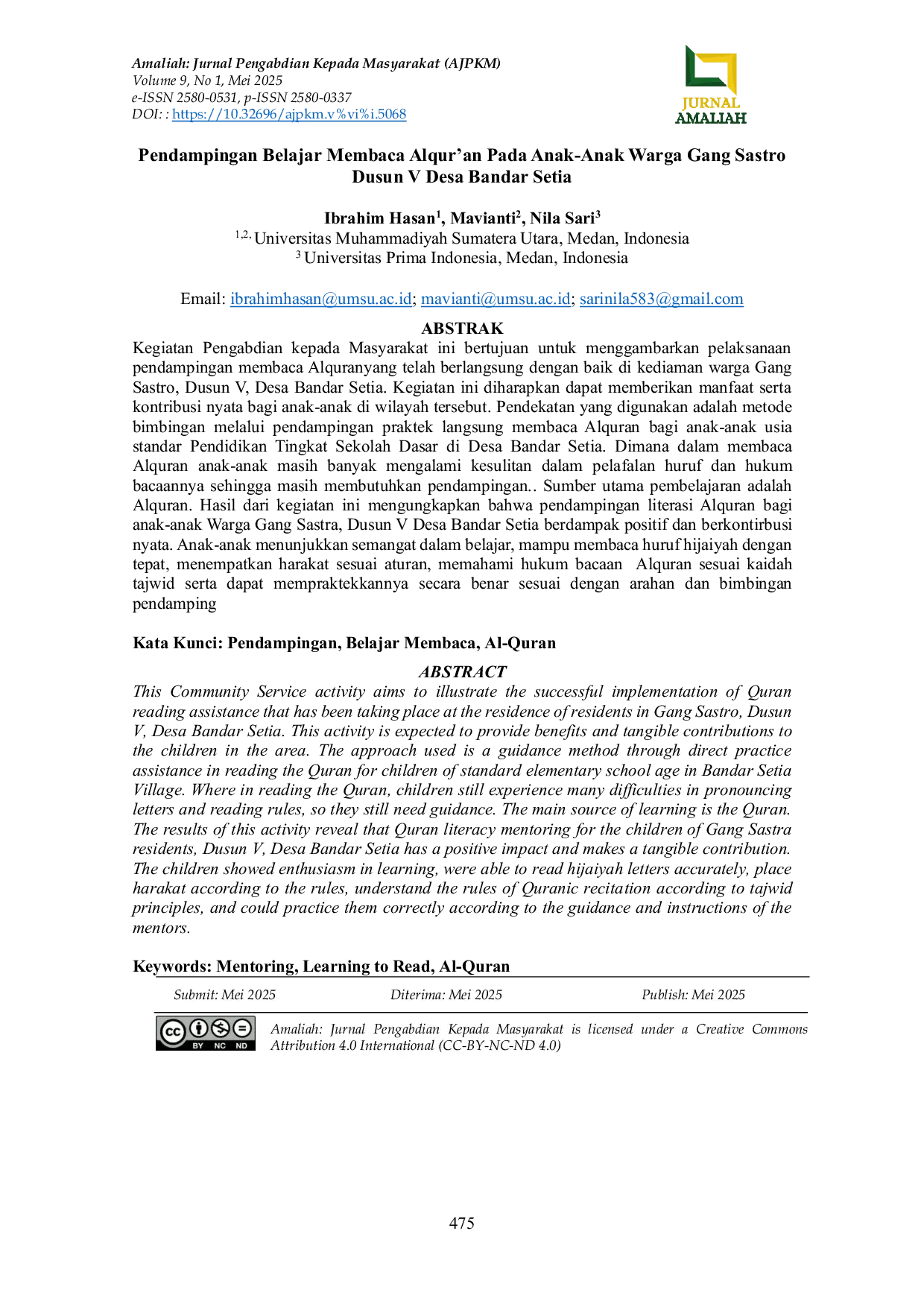 Amaliah: Jurnal Pengabdian Kepada MasyarakatAmaliah: Jurnal Pengabdian Kepada MasyarakatKegiatan Pengabdian kepada Masyarakat ini bertujuan untuk menggambarkan pelaksanaan pendampingan membaca Alquran yang telah berlangsung dengan baik di kediaman warga Gang Sastro, Dusun V, Desa Bandar Setia. Kegiatan ini diharapkan dapat memberikan manfaat serta kontribusi nyata bagi anak-anak di wilayah tersebut. Pendekatan yang digunakan adalah metode bimbingan melalui pendampingan praktik langsung membaca Alquran bagi anak-anak usia standar Pendidikan Tingkat Sekolah Dasar di Desa Bandar Setia. Dimana dalam membaca Alquran anak-anak masih banyak mengalami kesulitan dalam pelafalan huruf dan hukum bacaannya sehingga masih membutuhkan pendampingan. Sumber utama pembelajaran adalah Alquran. Hasil dari kegiatan ini mengungkapkan bahwa pendampingan literasi Alquran bagi anak-anak Warga Gang Sastra, Dusun V Desa Bandar Setia berdampak positif dan berkontribusi nyata. Anak-anak menunjukkan semangat dalam belajar, mampu membaca huruf hijaiyah dengan tepat, menempatkan harakat sesuai aturan, memahami hukum bacaan Alquran sesuai kaidah tajwid serta dapat mempraktekkannya secara benar sesuai dengan arahan dan bimbingan pendamping.